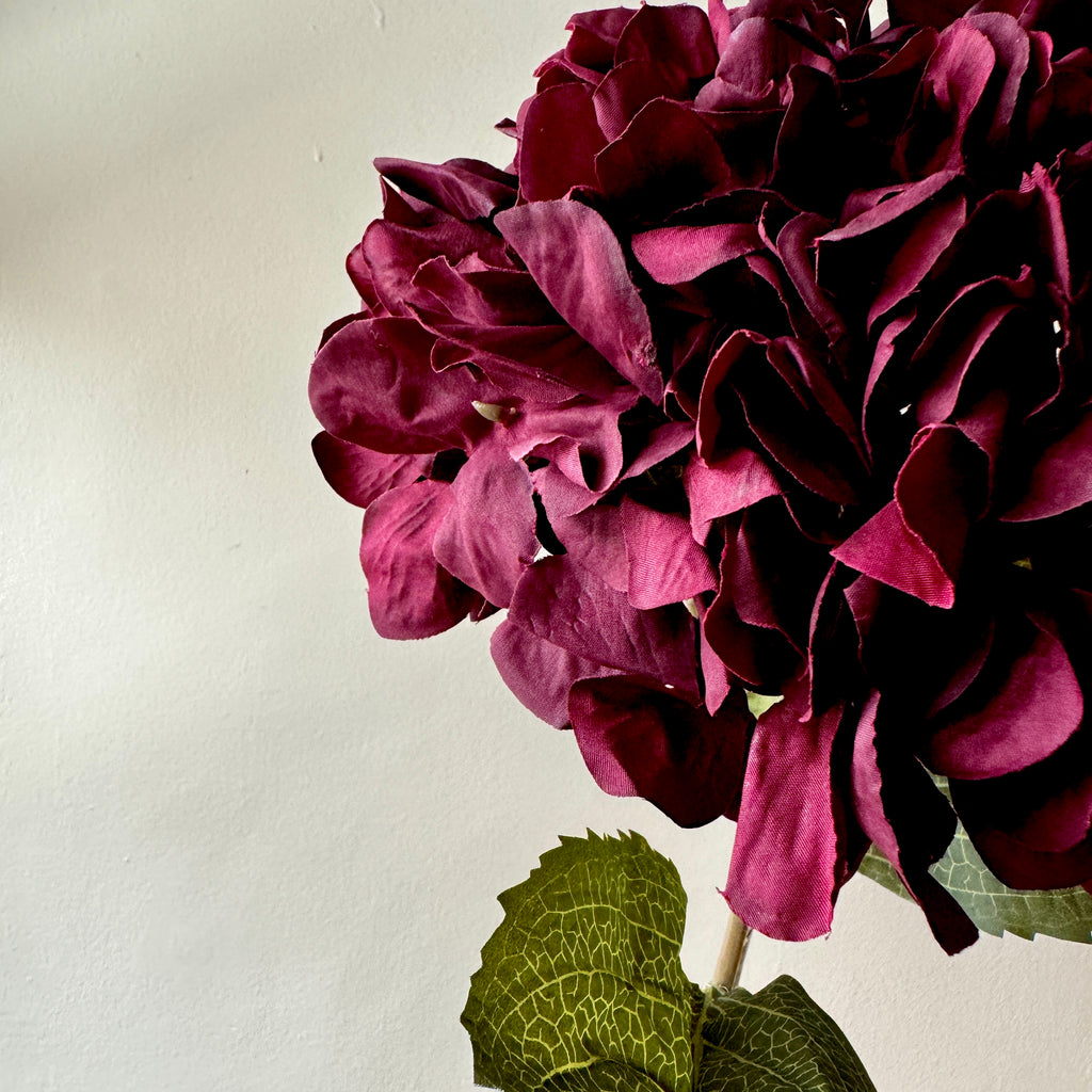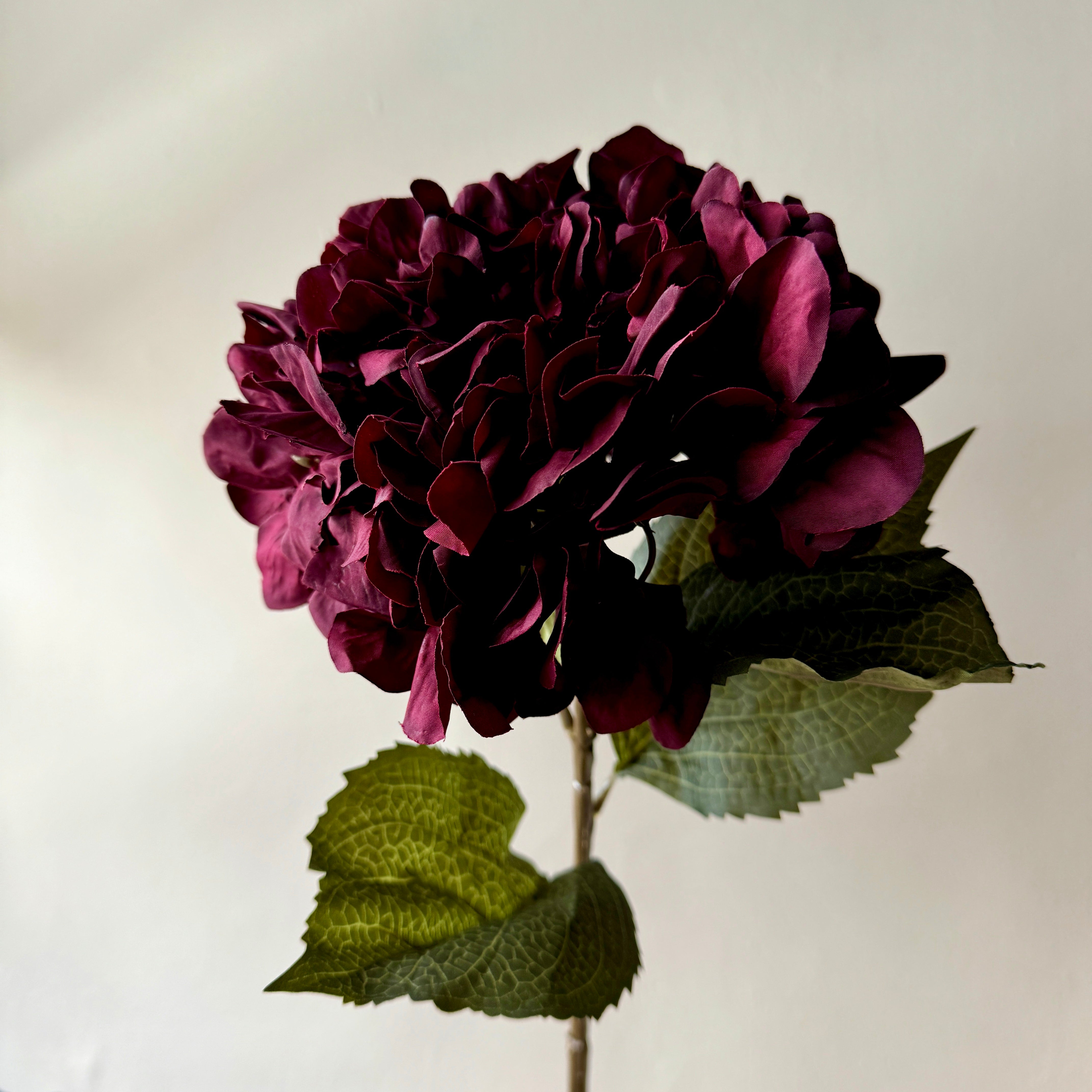 Featuring stunning deep mahogany petals and lush green foliage, this giant artificial hydrangea is by Gisela Graham and will elevate your seasonal bouquets with warmth, depth and texture.