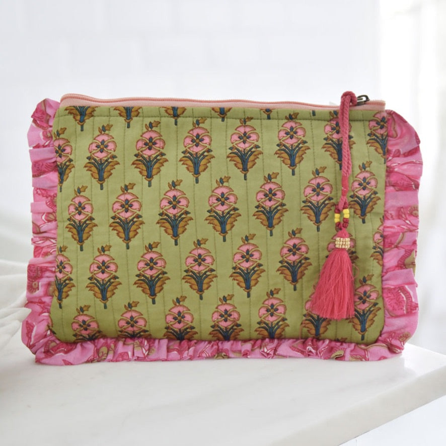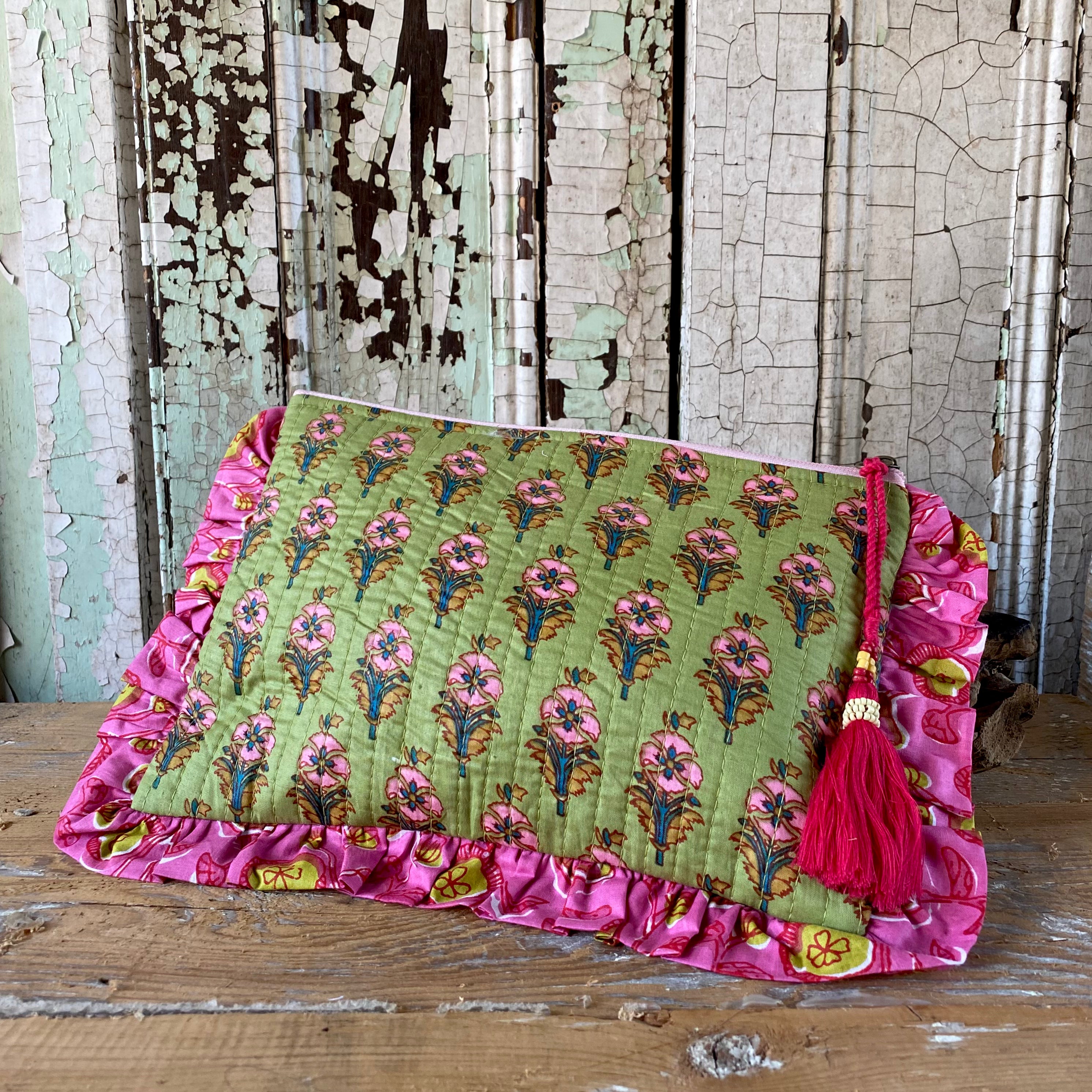 This wash/make up bag has a quilted fabric beautifully show casing a bold, block print upon quilted fabric.