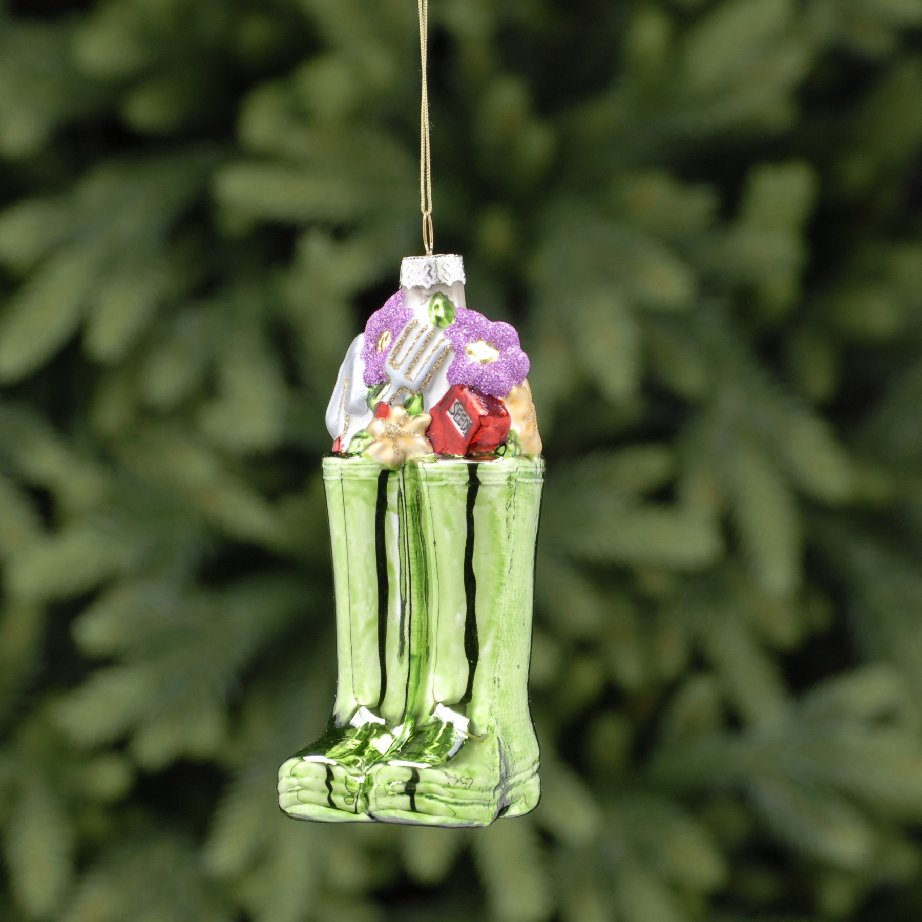 This oversize Christmas tree decoration depicts a pair of bright green wellington boots, filled with gardening tools, glittered garden flowers and a cute packet of seeds. Certain to raise a smile on any Christmas tree.