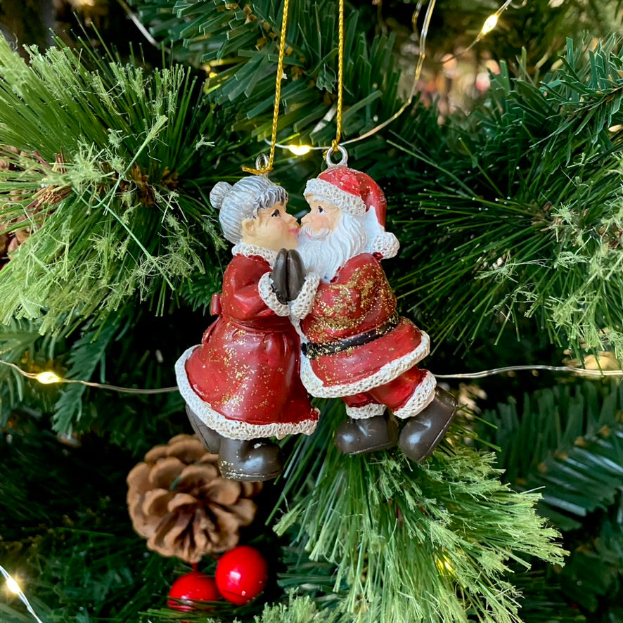 Add a touch of Christmas cheer to your tree with this charming Mr & Mrs Santa Claus decoration. The merry couple are captured mid-dance, looking cosy and full of joy in their traditional red-and-white outfits. With rosy cheeks, warm smiles, and delightful festive details, they perfectly embody the spirit of the season.