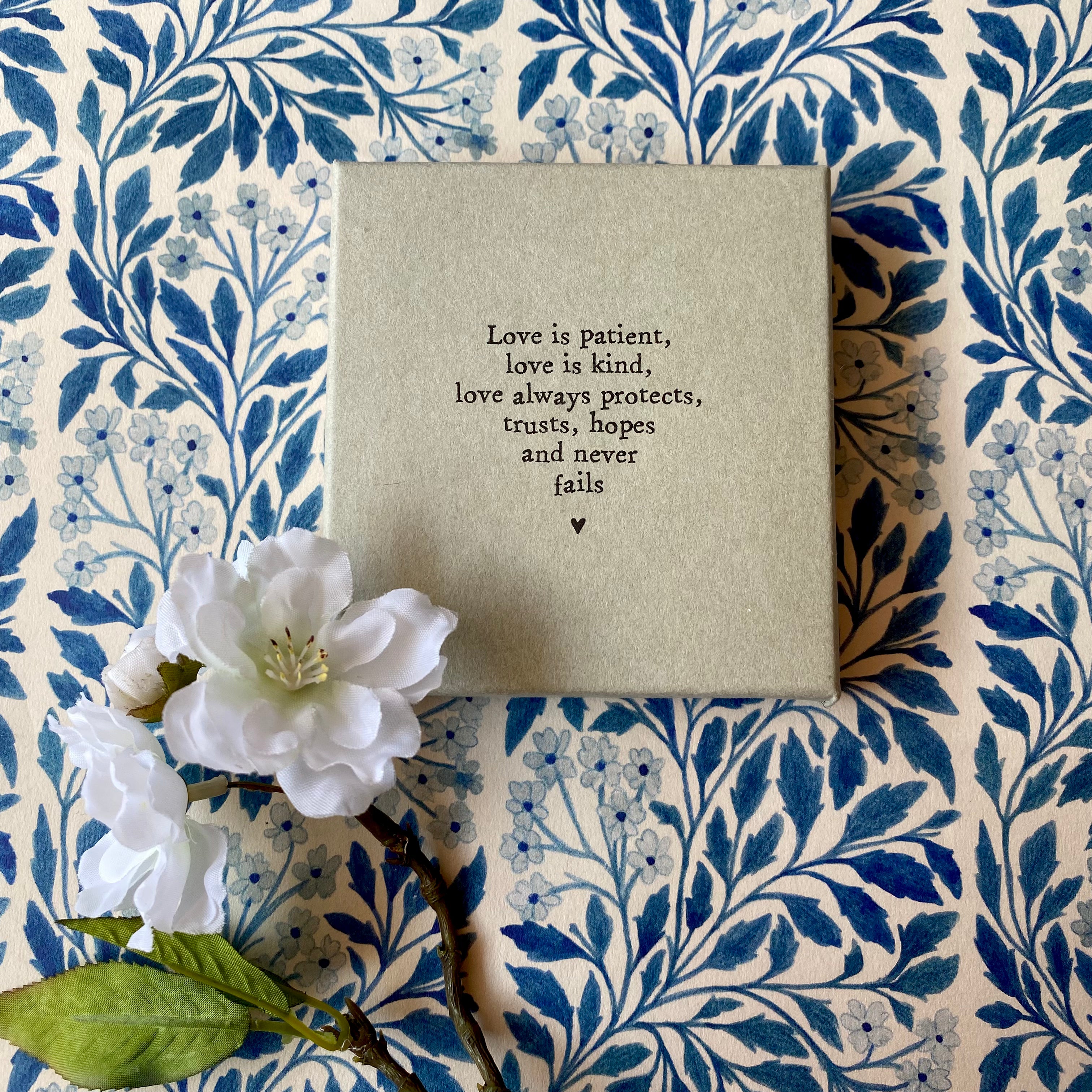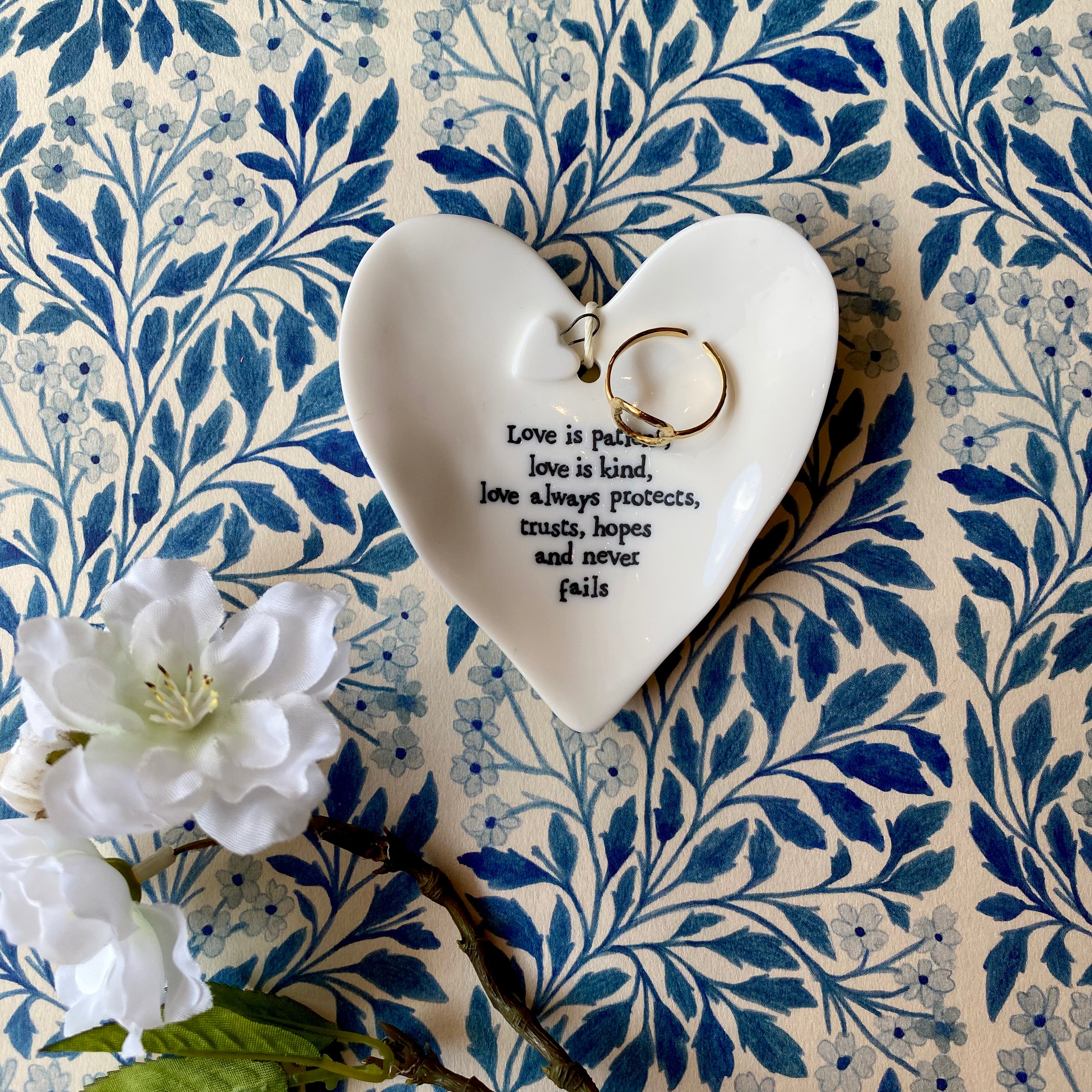 This white porcelain trinket dish with “Love is patient, love is kind, love always protects, trusts, hopes and never fails” embossed in typewriter font is a sweet gift for a friend or for yourself. With non-uniform edges this piece looks beautifully handmade. The perfect ring trinket dish that comes in a recyclable box with the same text from the trinket dish.