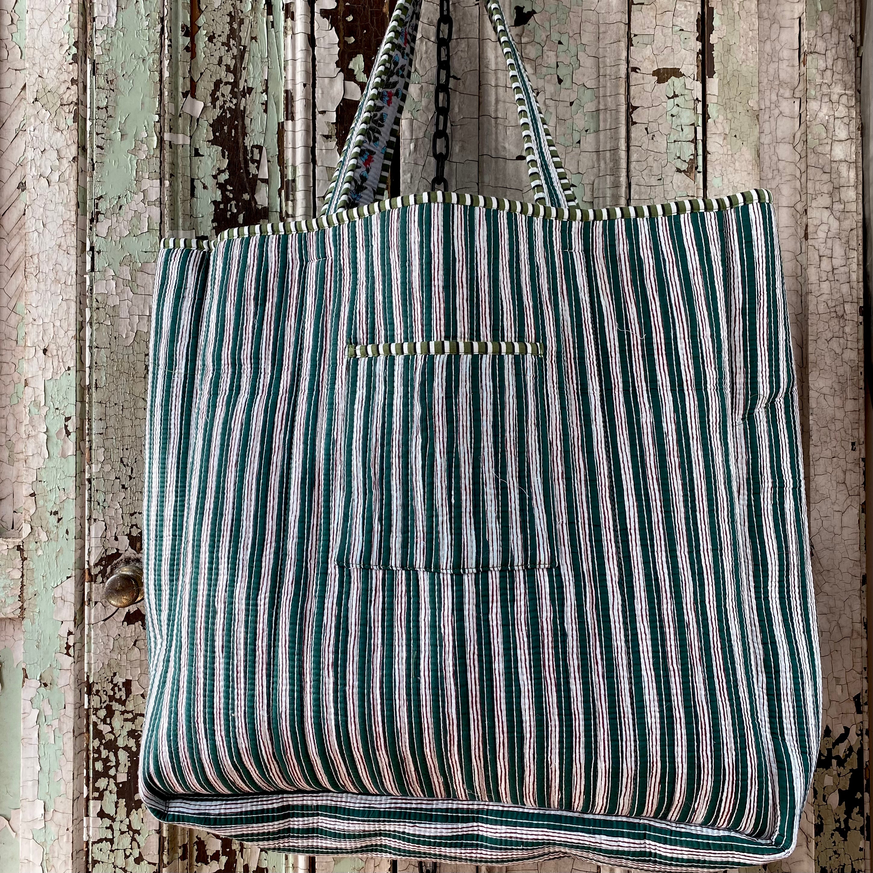 Handmade Reversible Shopper - Lrg., Green on White, Lavender Flowers