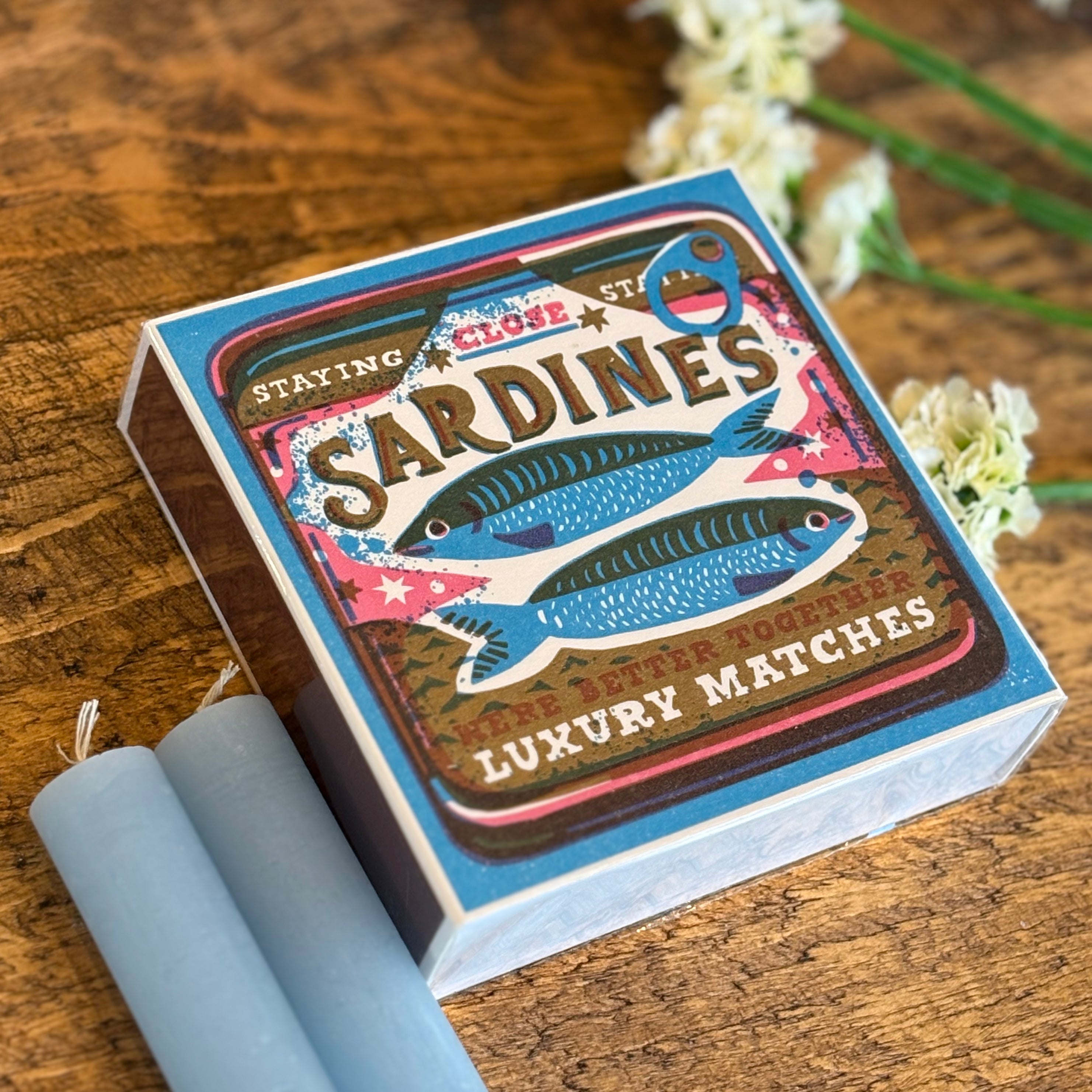 This matchbox, made of blue paper and featuring a beautiful illustration of sardines, makes a wonderful gift. The 'Better Together’ matchbox measures 11cm square, and contain approx. 125 matches with white tips.