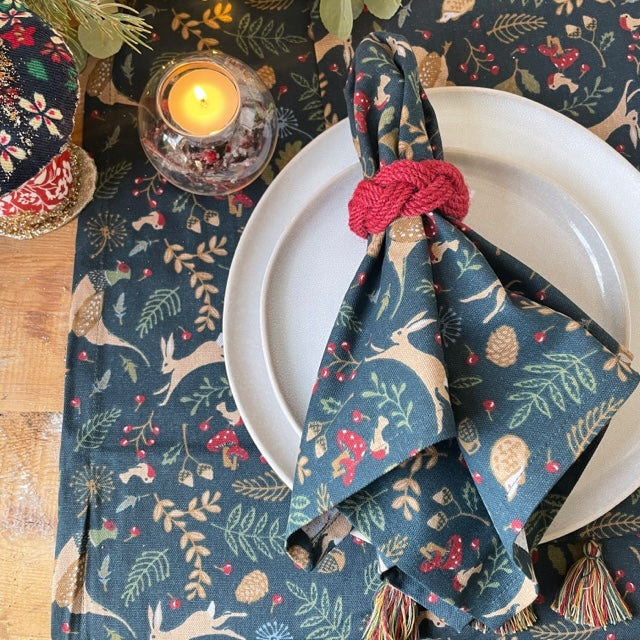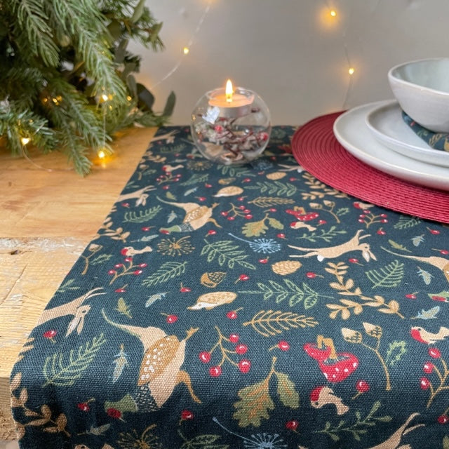 A deep navy coloured table runner beautifully printed with woodland depictions. A cool contemporary take on a cottagecore vibe, this lovely pattern is abundant with pheasants, hares, toadstools, berries among other flora and flauna.