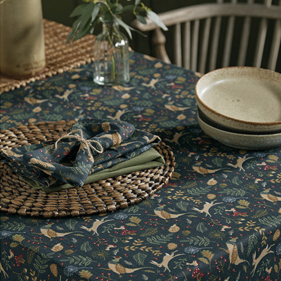 A beautifully printed table cloth with woodland depictions. A cool contemporary take on a cottagecore vibe, this lovely pattern is abundant with pheasants, hares, toadstools, berries among other flora and flauna.