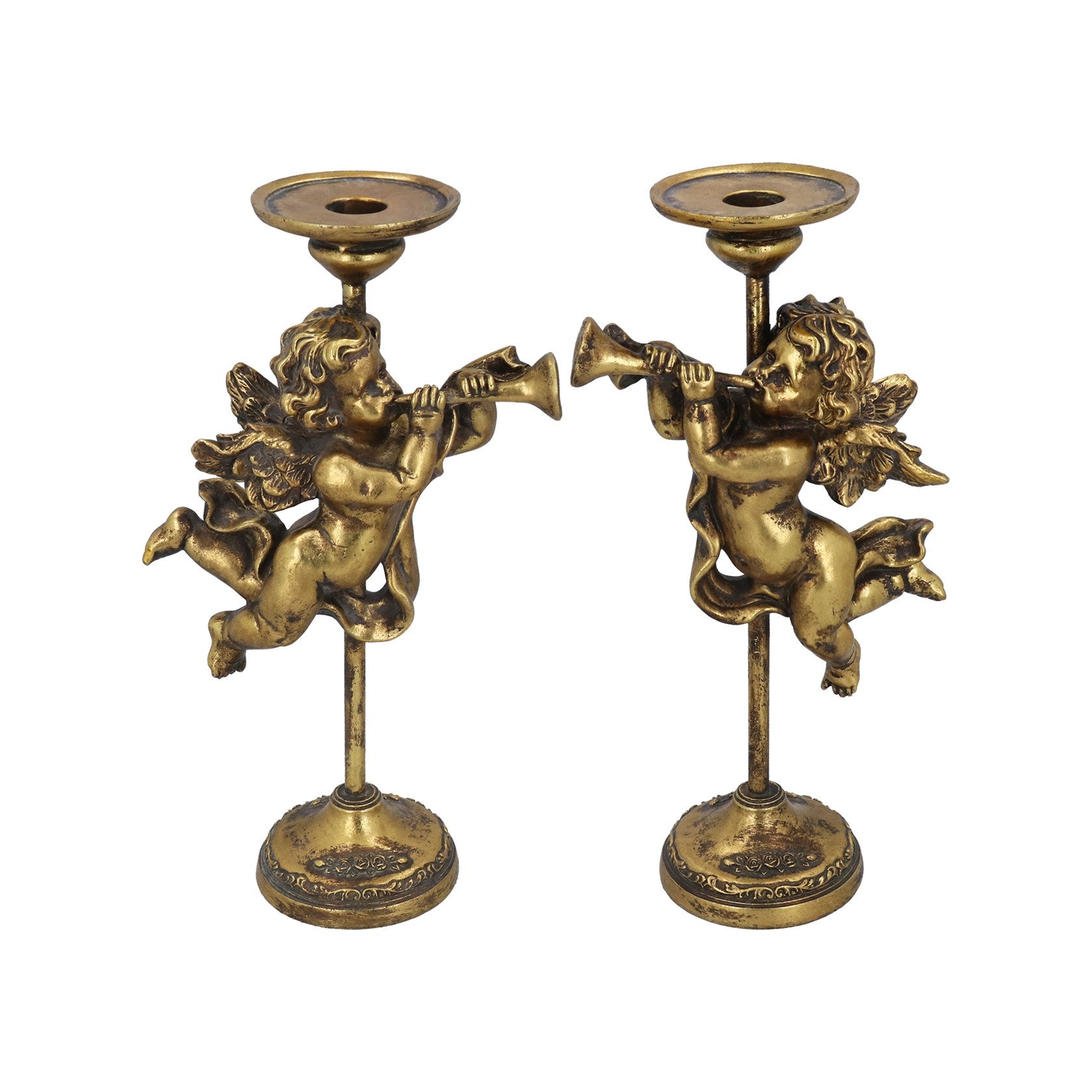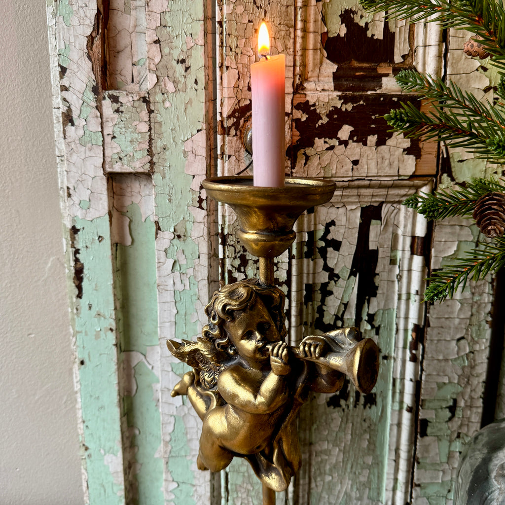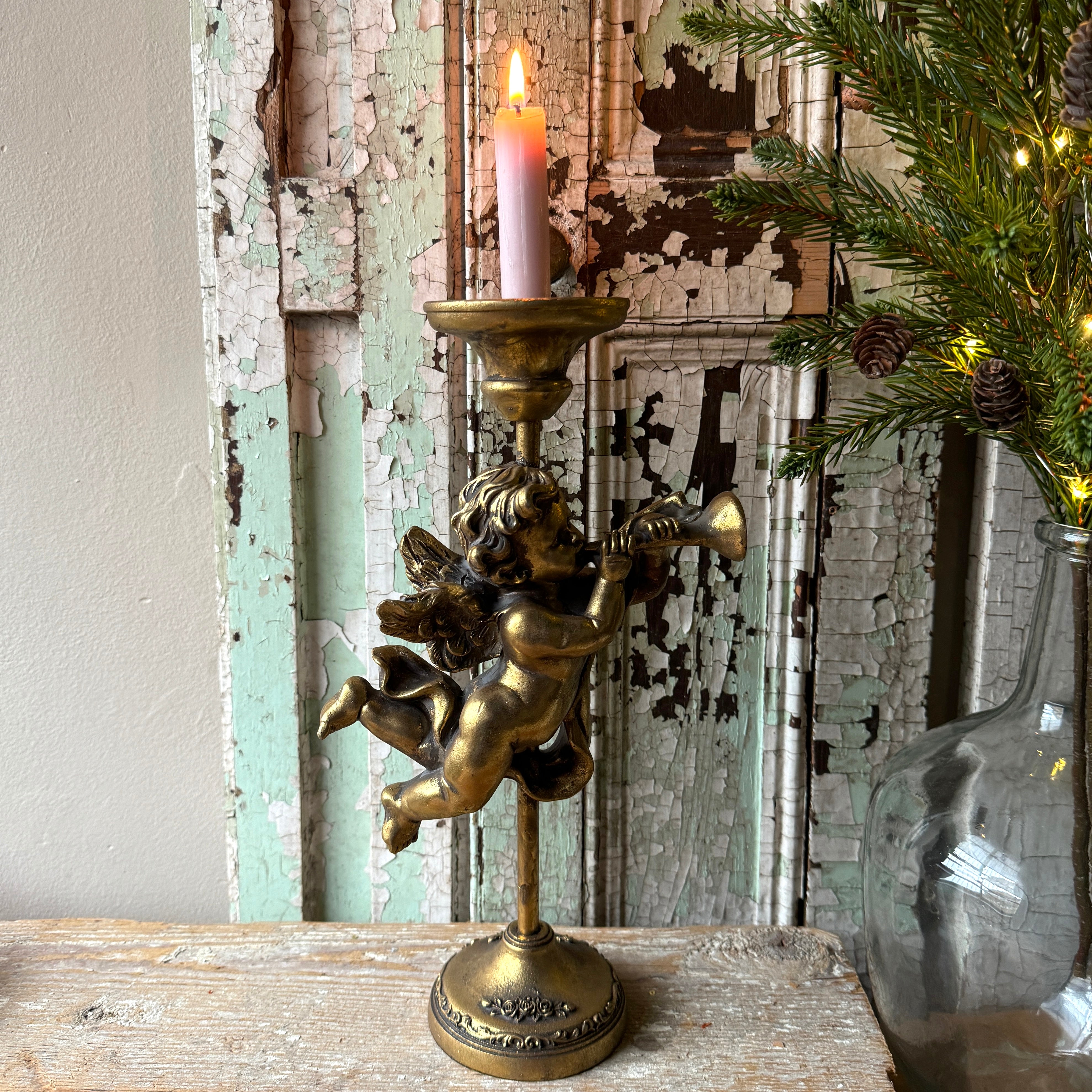 Add a burst of elegance to your dinner table with this glistening gold candle holder. Adorned with intricate patterning and roses around the base, this trumpet playing cherub makes for a beautiful decoration.