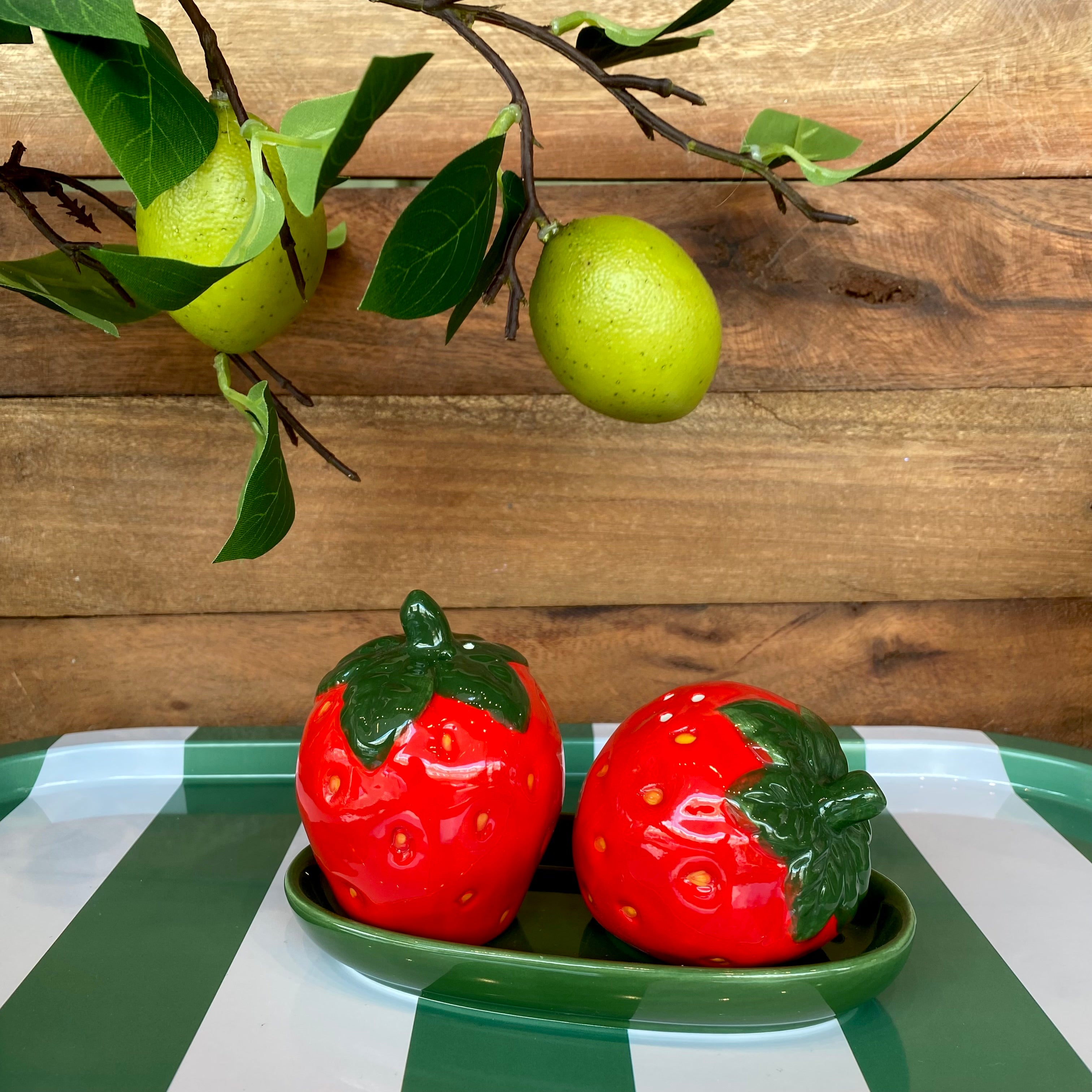Add a touch of charm to your table with this ceramic strawberry salt and pepper set, featuring vibrant red berries with green leafy tops. A delightful accent for any kitchen or dining space.
