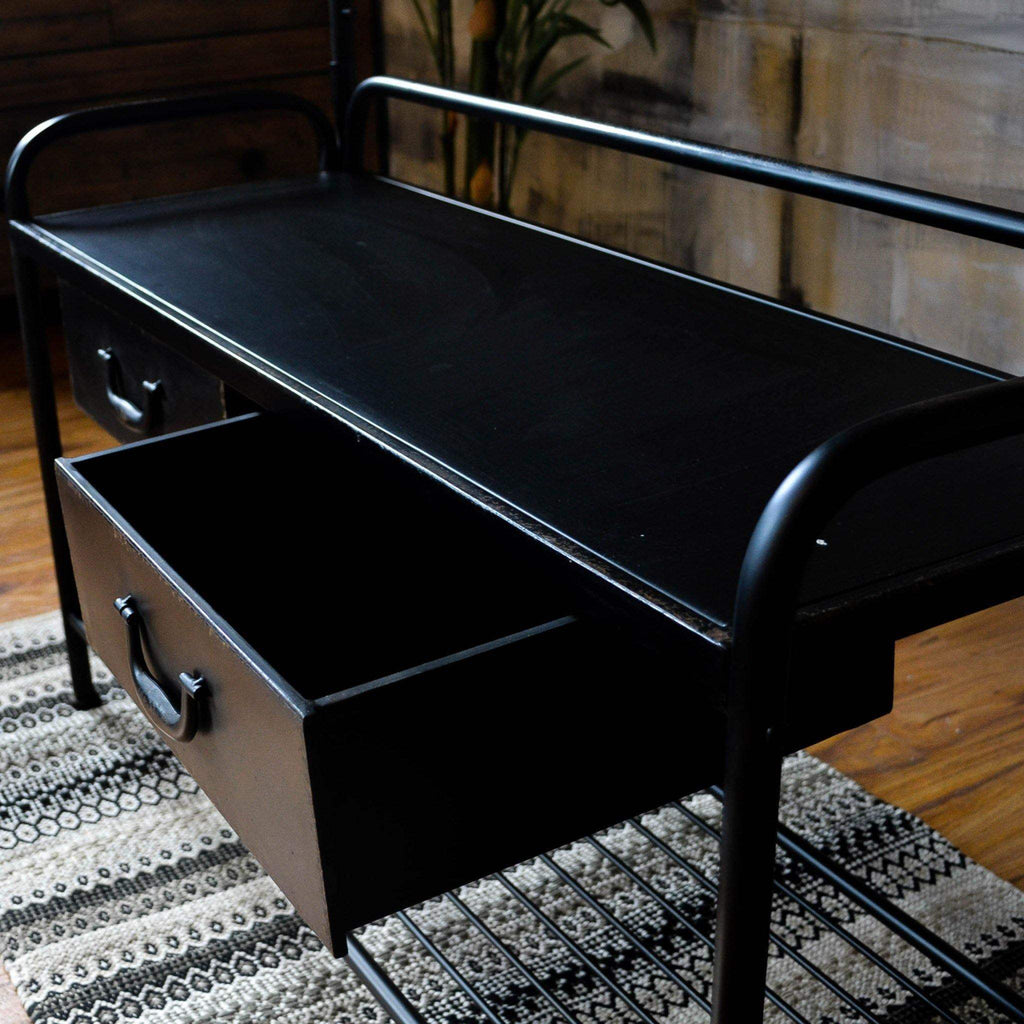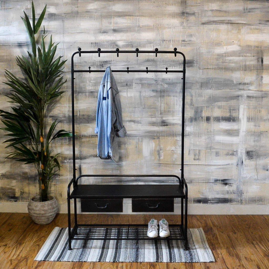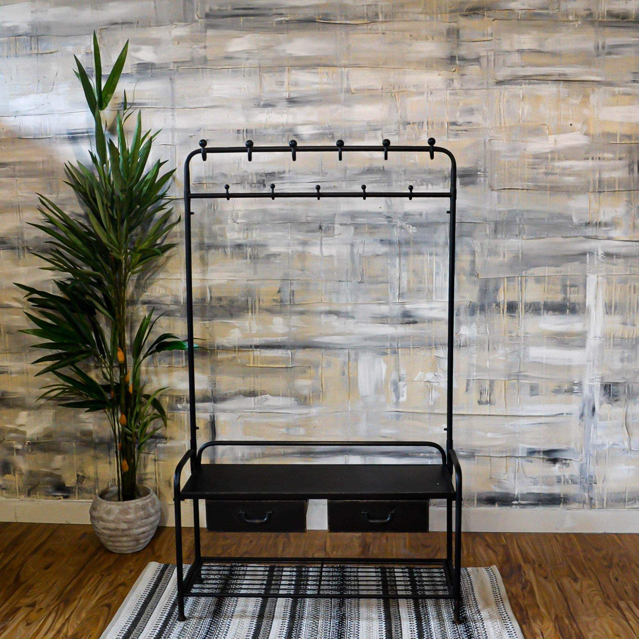 Black Metal Coat Rack Bench Measures: H173 x W104 x D36cm.