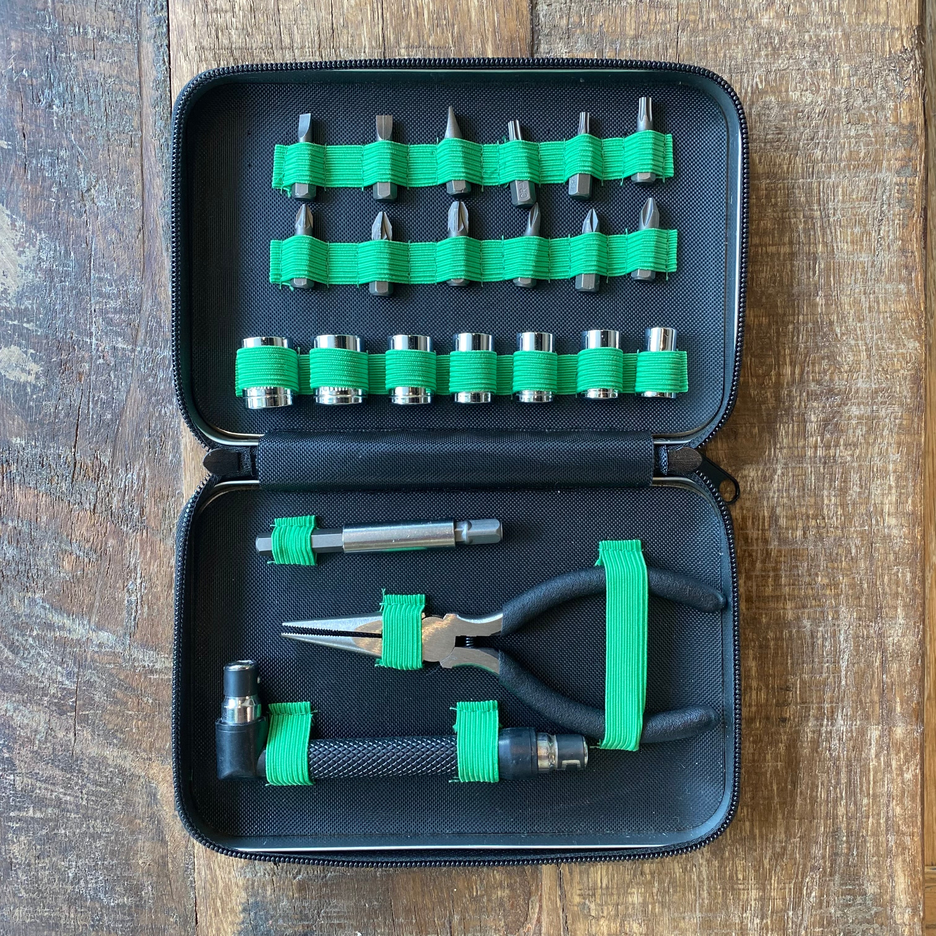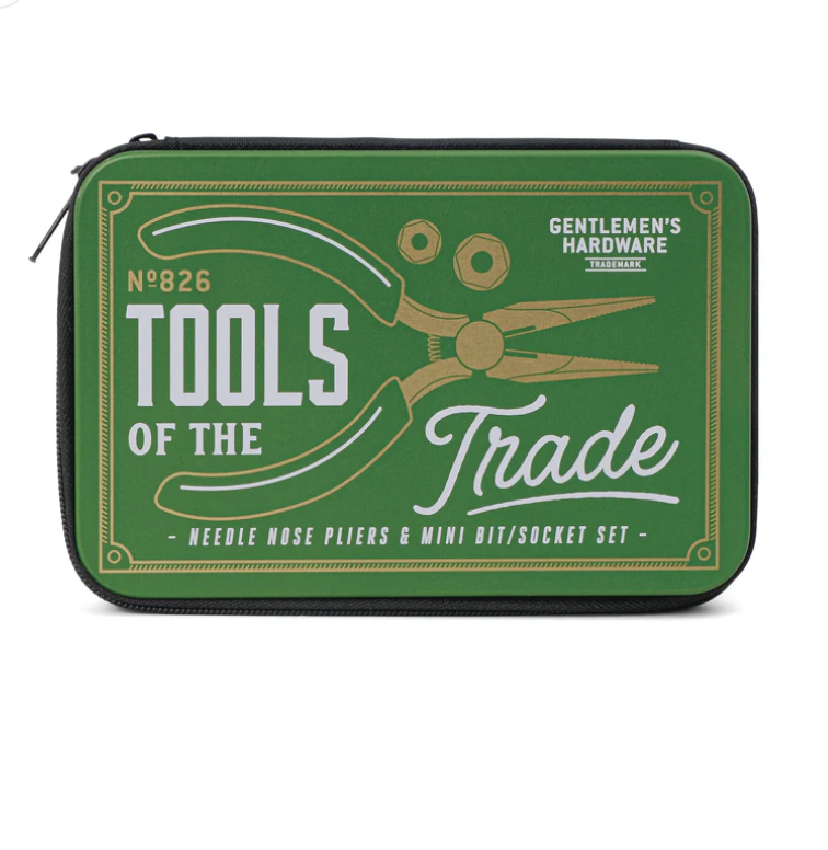 This compact tool kit includes a 19-piece mini bit and socket set, along with a pair of needle nose pliers—perfect for tackling small tasks. Everything fits neatly into the included fabric-lined tin pouch for convenient storage, easy transport, and thoughtful gifting