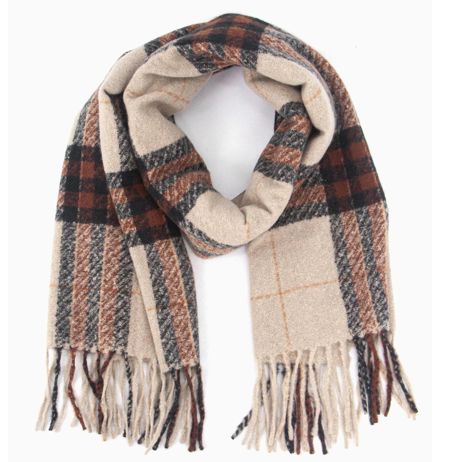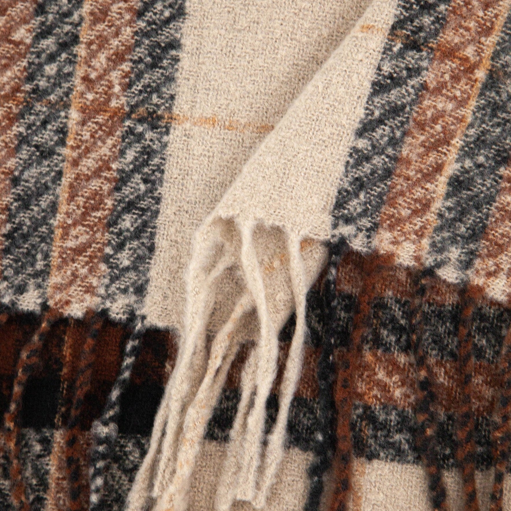 A nostalgic take on the classic winter scarf, here in oatmeal, brown and black with a tasselled fringe.