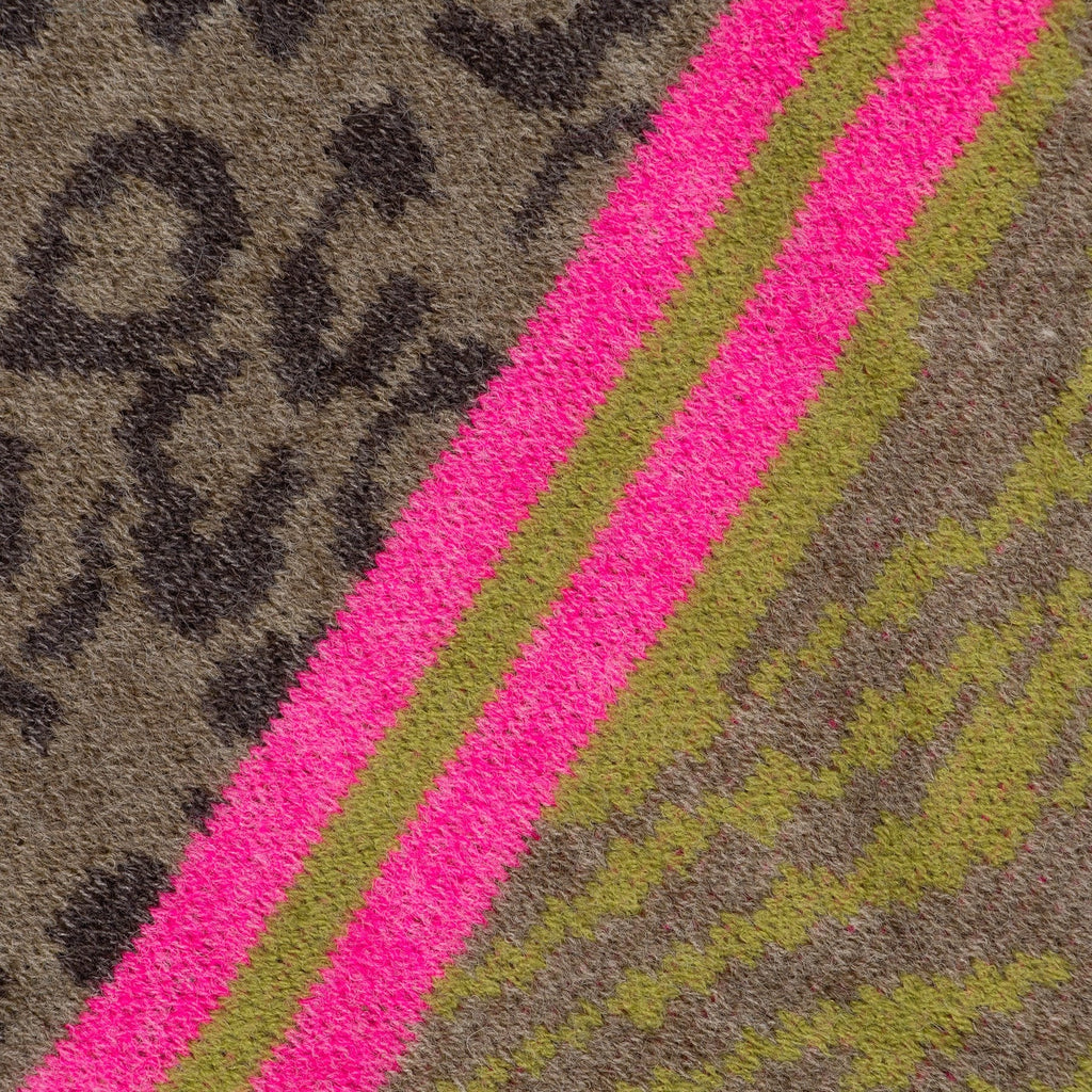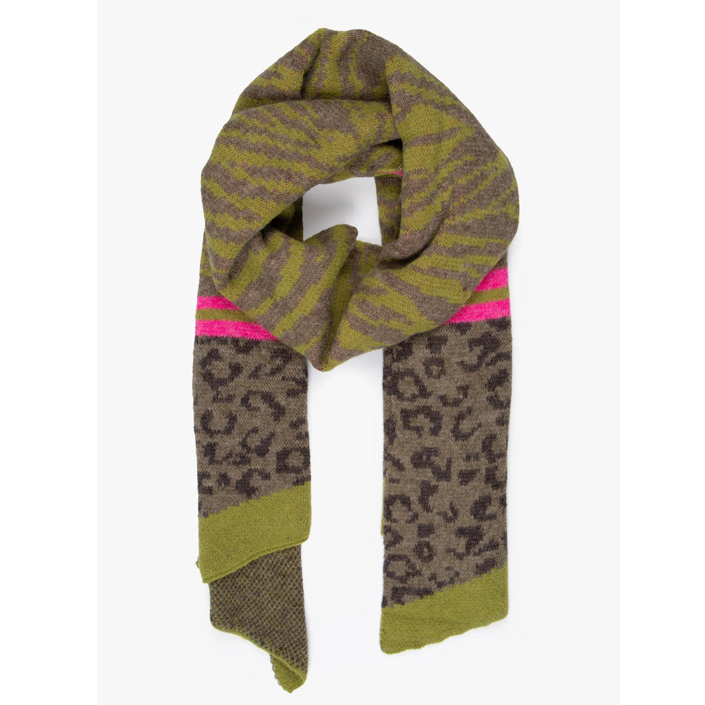 A colourful big soft winter scarf showcasing leopard and tiger animal prints, with bright pink stripes.