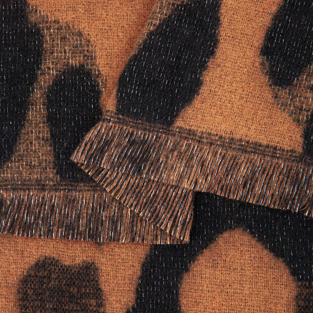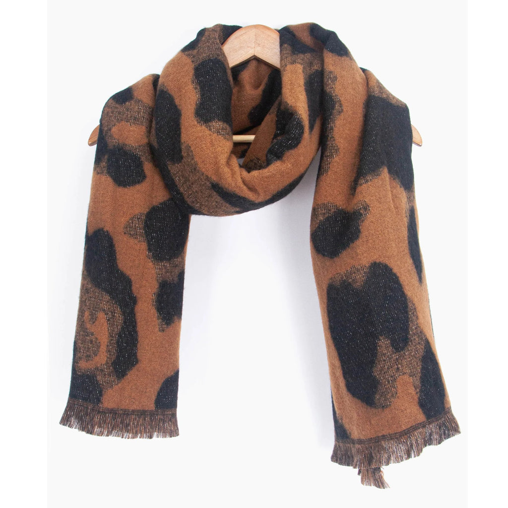Big soft scarf in a bold leopard pattern in neutral black and brown colours. Features a flattering, sparkling glitter throughout the weave and a short fringed edge.