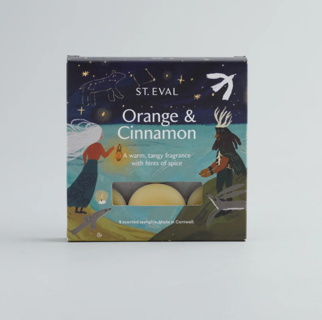 The scent of St.Eval’s Orange & Cinnamon tea lights are uplifting with aromatic festive fruits and spices. Warm and tangy with a hint of spice.