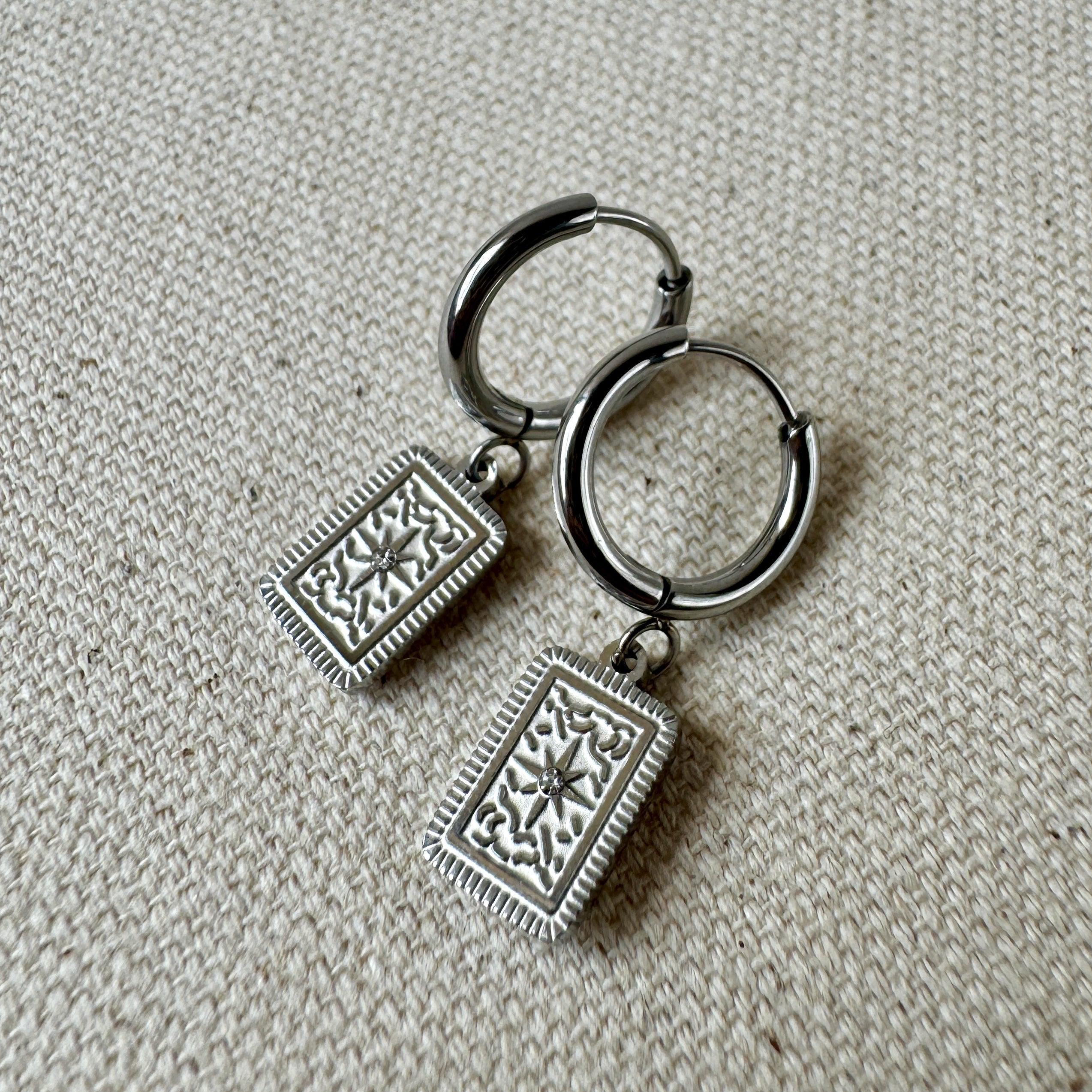 Everyday Earrings - Huggie Hoops, Silver Tablet Starburst Pendant, this pair of waterproof huggie hoops will add instant sparkle to any outfit. The clasp hoop fastening makes them super easy to snap on and off - A gorgeous gift for yourself or a friend.