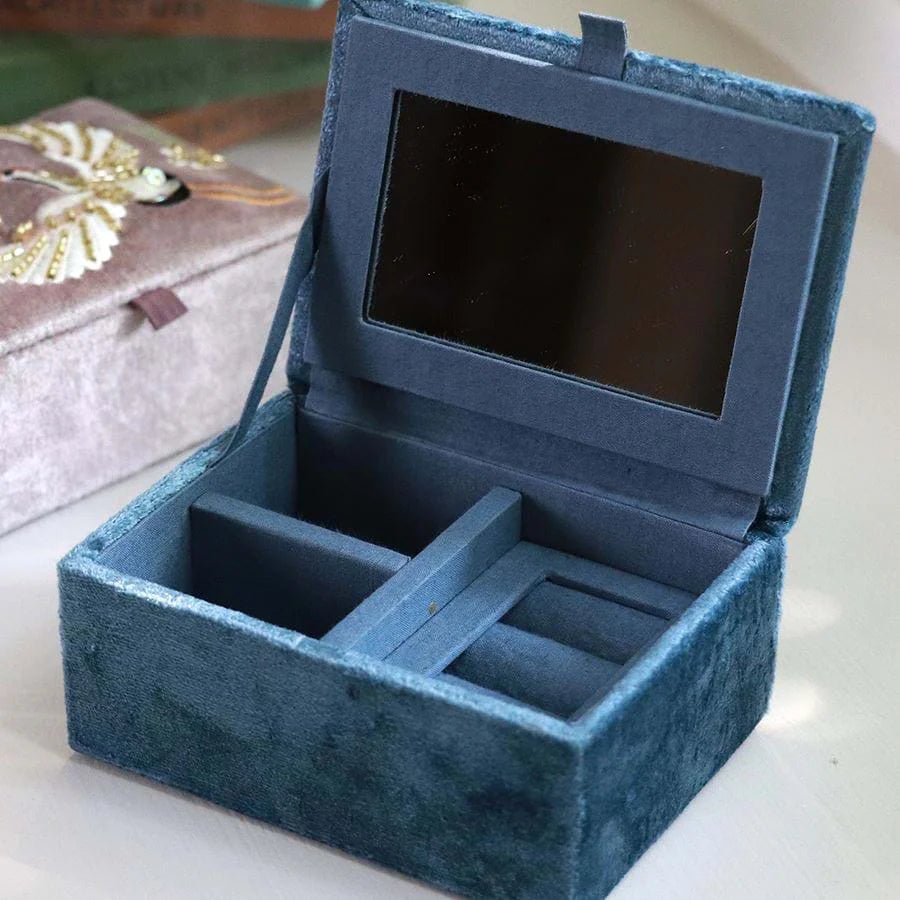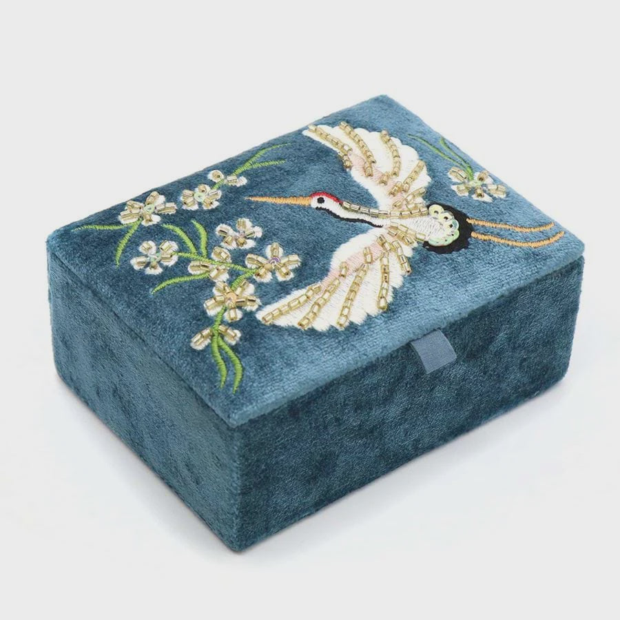 A jewellery box in soft blue velvet with a crane and floral beaded embroidery. Inside you will find two small compartments on the left, a ring and earrings holder on the right, to keep your treasures tidy. A mirror on the inside of the lid, is a welcome touch for added glam.
