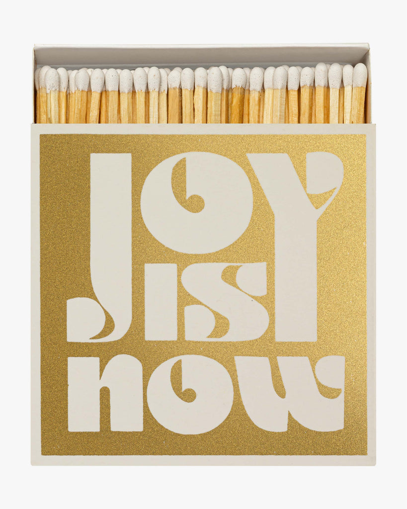 This matchbox is grey with the words; JOY IS NOW, in white and make a wonderful gift. The ‘Joy is now’ matchbox measures 11cm square, and contain approx. 125 matches with white tips.