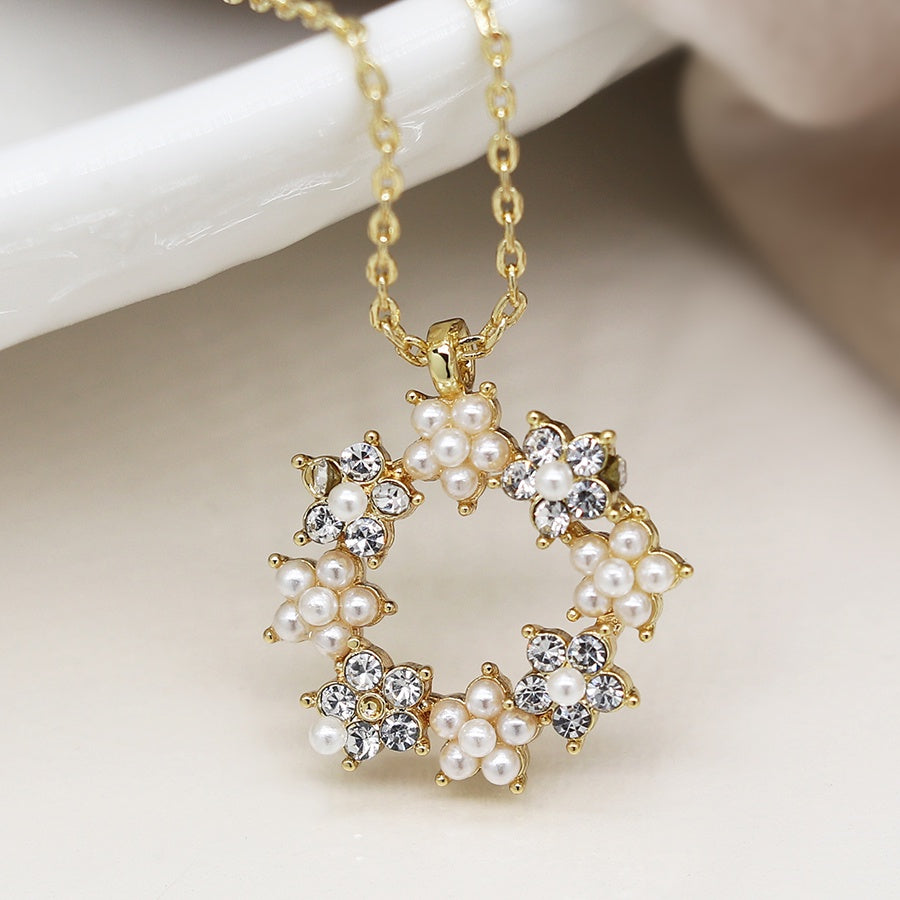 Beautiful faux gold necklace with antique looking pendant of a floral wreath, featuring alternate clear crystal and ivory pearl flowers.