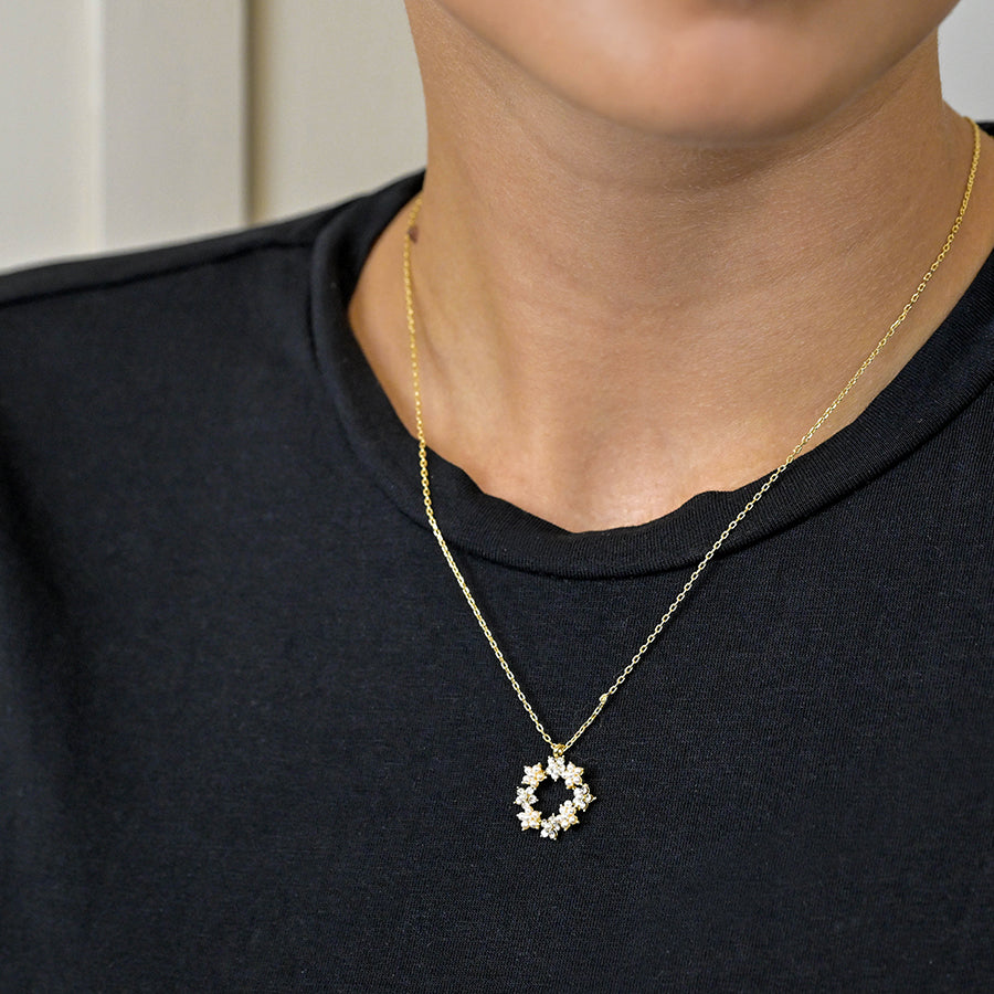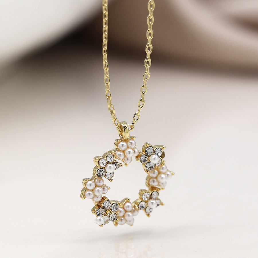 Necklace - Gold Floral Circle Pendant with Crystals & Pearls