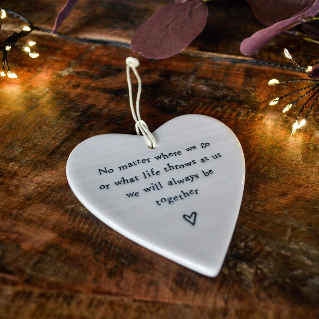 A hand finished porcelain hanger by East of India. Strung on paper string, this porcelain plaque shaped like a heart and carries the message " No matter where we go or what life throws at us we will always be together"