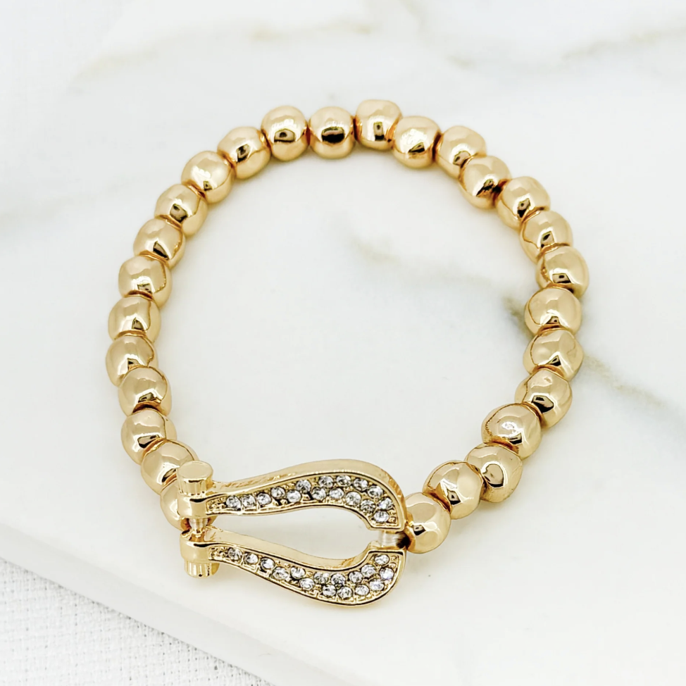 Bracelet - Gold Stretch & Crystal Horseshoe. This sparkling bracelet features a crystal embellished horseshoe charm for those who like to bring a little bit of luck into their lives.