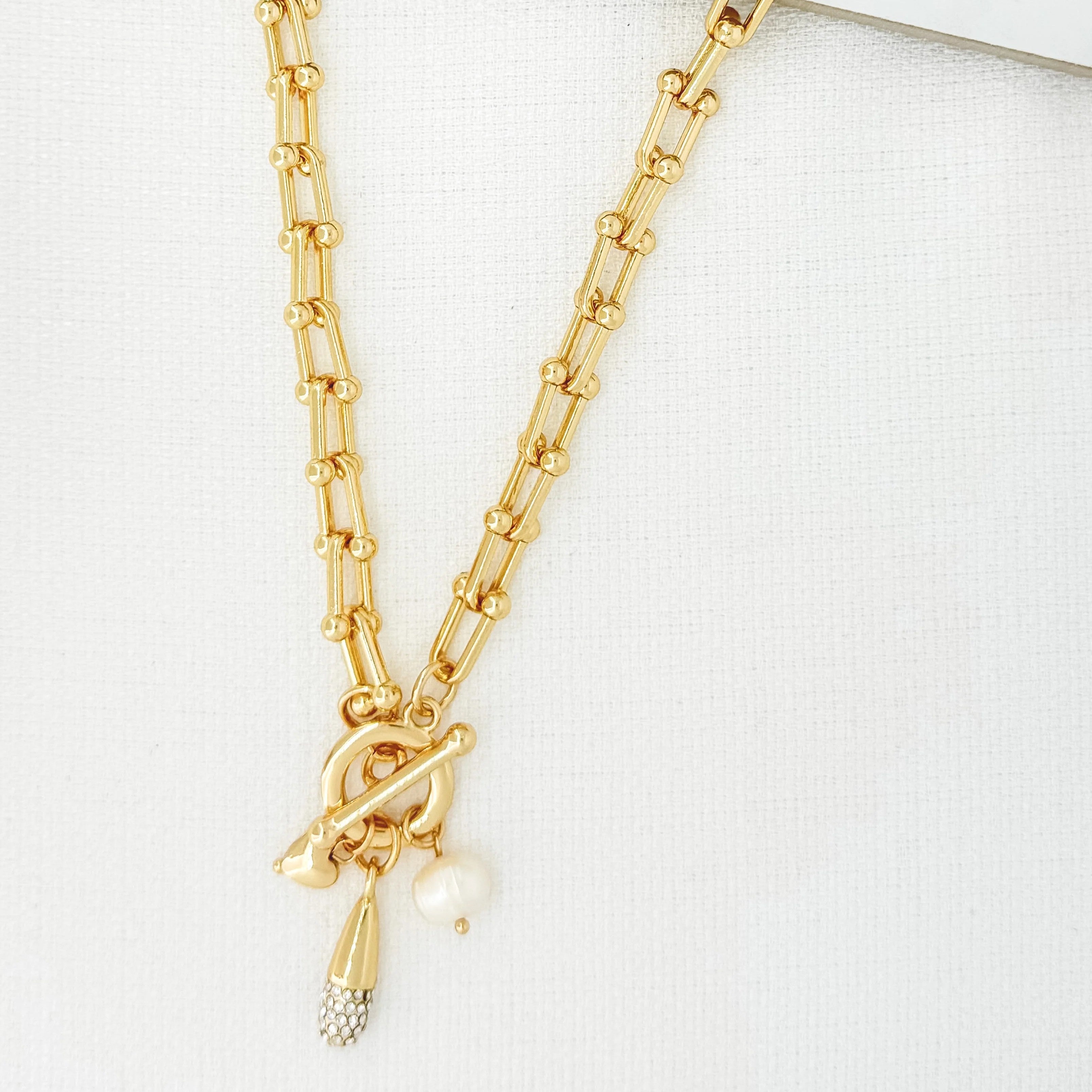 Necklace - Short Gold T-Bar & Diamante Charm. This short necklace features a sleek T-bar detail paried with diamantes for just the right amount of sparkle!