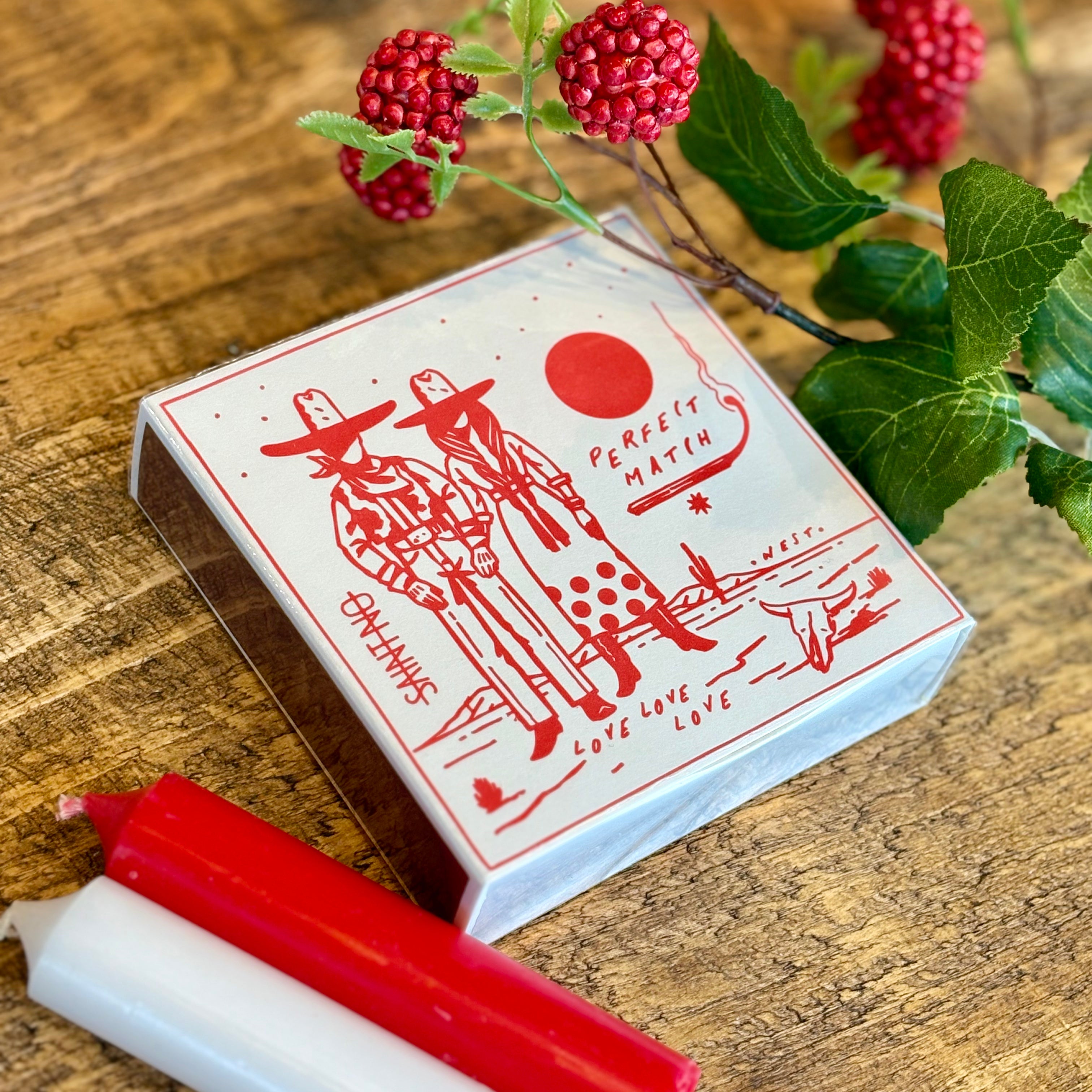The Saint No's 'A Cowboy's Perfect Match' matchbox measures 11cm square, and contain approx. 125 natural matches with red tips. Featuring a striking design of red ink over white of 'A cowboy's perfect Match' couple on the prairie, it makes a cool wedding gift too.