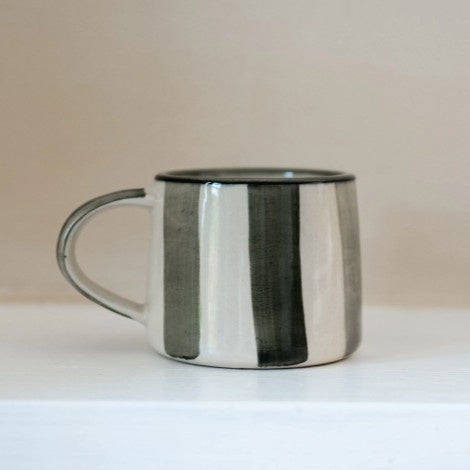 Hand painted with forest green/taupe stripes over a white background, each mug is unique, bringing a personal touch to each sip.