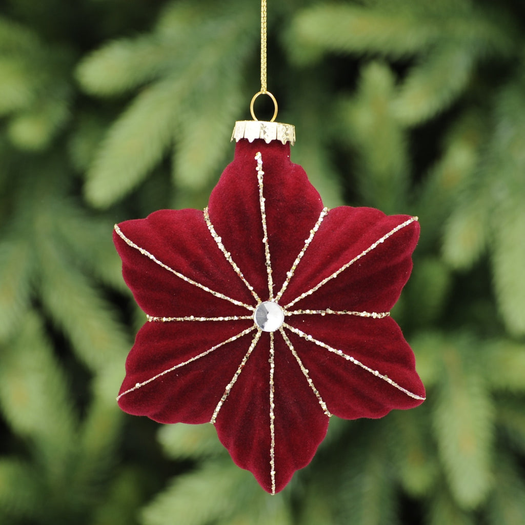 This festive 6‑point star ornament features a rich, deep red finish giving a velvety textured look and glitter details that catches the light softly.