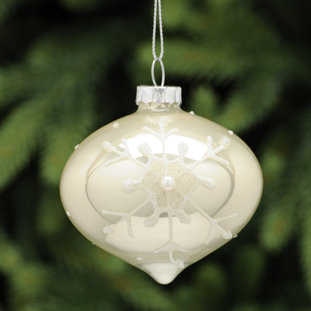 Bauble - Glass Onion, Light Gold & White Snowflake, 8cm made from pearl effect glass, with white and gold detailed snowflake. Perfect to add a little decorative interest flourish to your regal Christmas tree scheme.