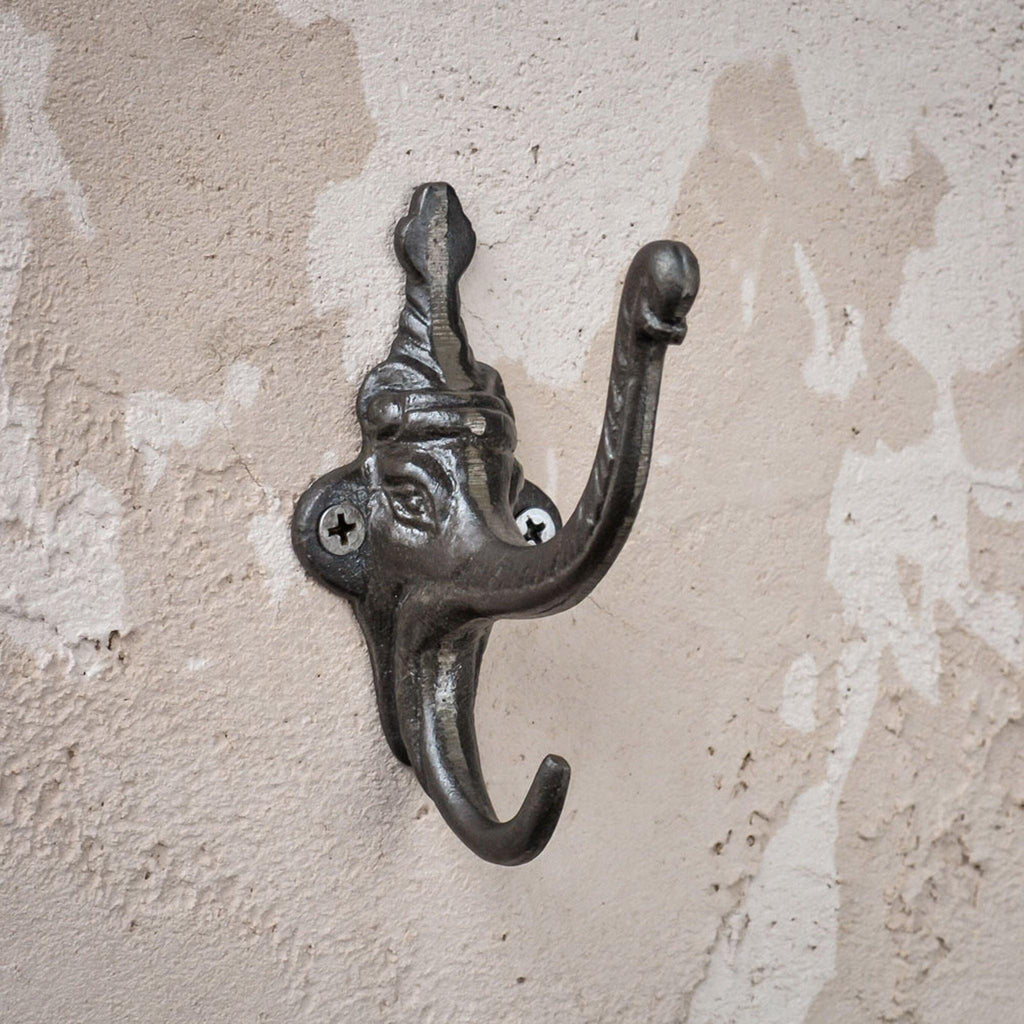 This double hook is cast in the shape of an Indian elephant, with his trunk and tongue forming the extruding hooks. This hook is fixed to the wall using two screw holes that sit within the elephants ears. Being cast iron, this piece has an industrial feel and is especially sturdy.
