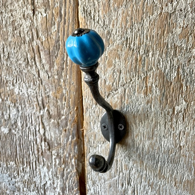 Cast Iron double coat hook with ceramic shell detail. This industrial iron double hat & coat hook is given the decorative treatment with this ornate colourful shell detailing. Use multiple hooks to create a coat rack in your hallway, and why not mix up colours for maximalist effect.