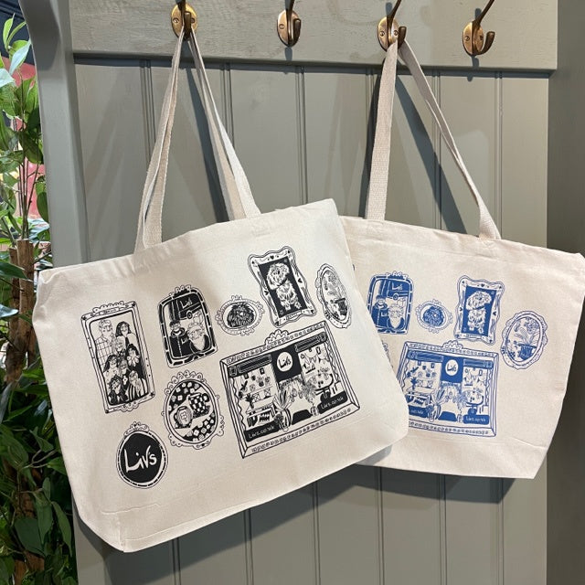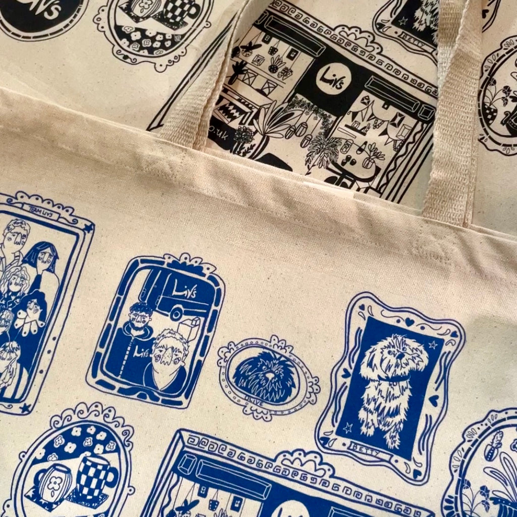 Everyone loves a tote bag! Which is why we were so excited to design our own. Depicting a cluster of hand drawn photo frames, with imagary of our lovely shop front, team and shop dogs. This beautiful design was created by Erin, talented illustrator and our very team member here at the shop.