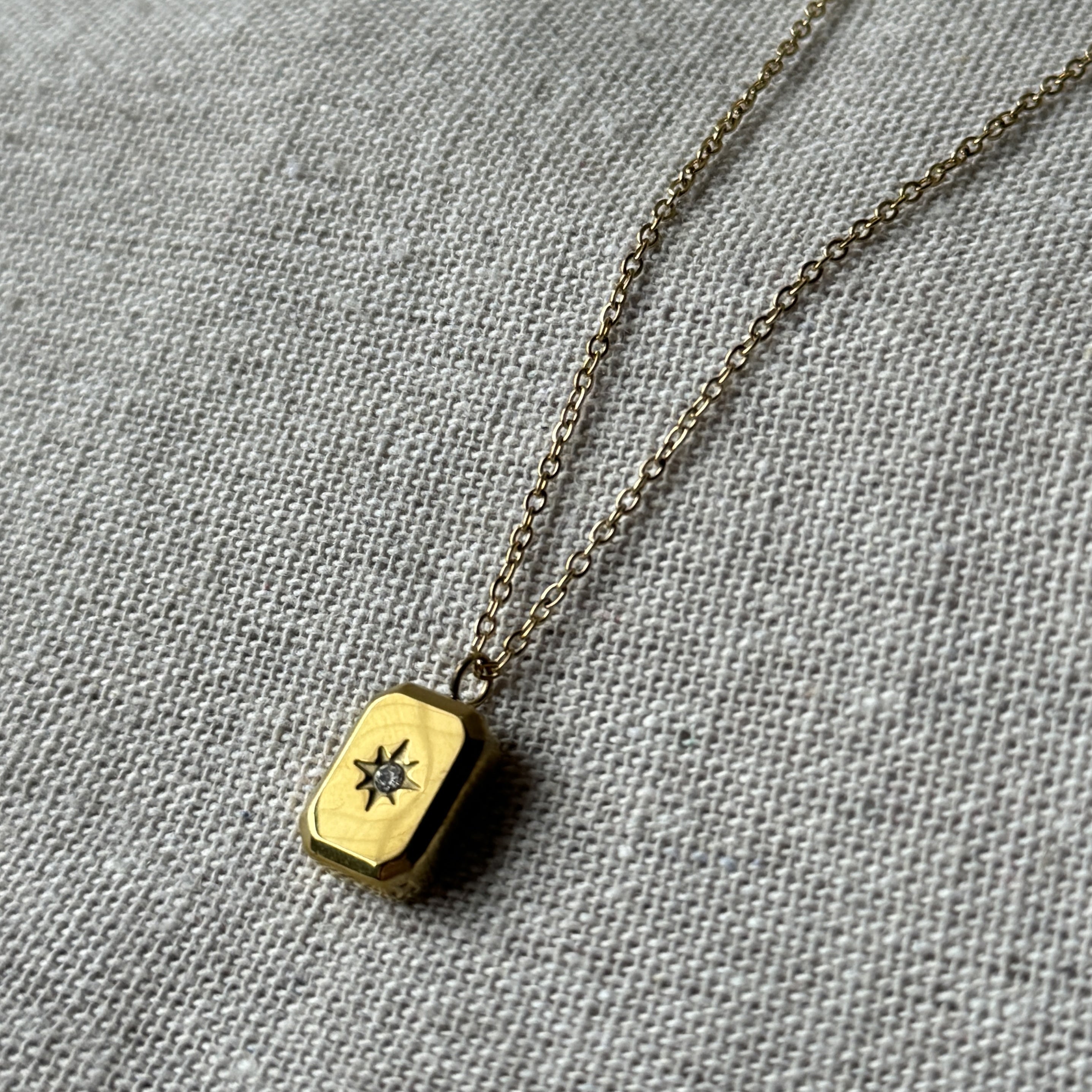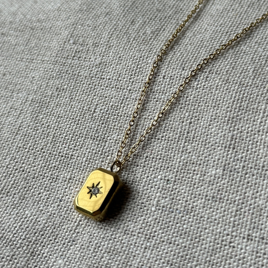 Everyday Necklace - Gold Starry CZ Box Pendant. This waterproof necklace will add some vintage sparkle to any outfit, perfect to layer with other chains - A gorgeous gift for yourself or a friend.