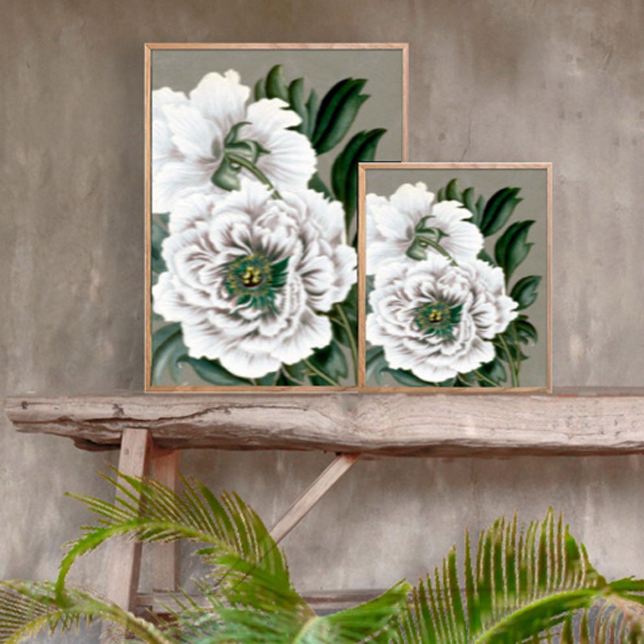 Available in 2 sizes, this print of beautifully hand drawn oversized white peony’s with green