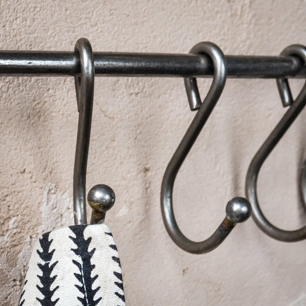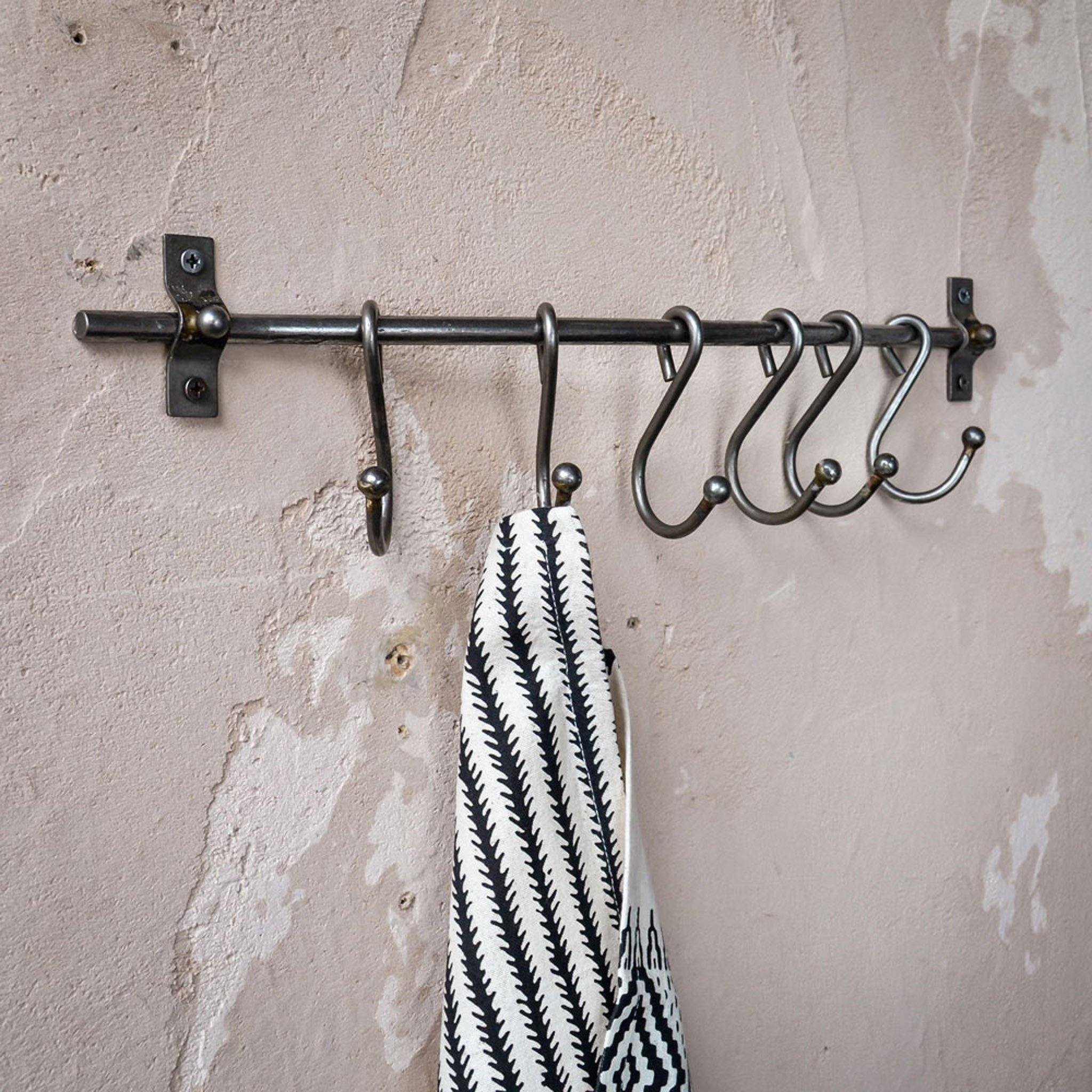 Cast iron rail with 4 sliding hooks. Our iron rail with sliding hooks is an ideal storage solution for any home. Wether its in your kitchen for pots and pans or in your hallway for coats and jackets its sure to suit your storage needs.