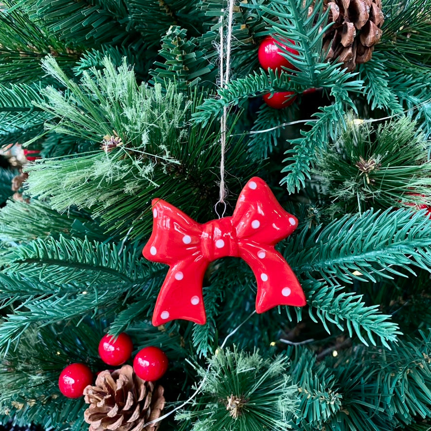 Hanging Dec - Ceramic Red Spotty Bow, 7cm