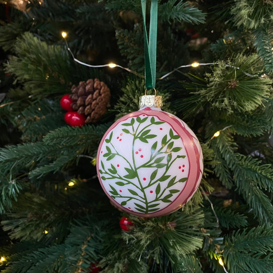 Glass Bauble - Pink & Green Hand Painted, 8cm
