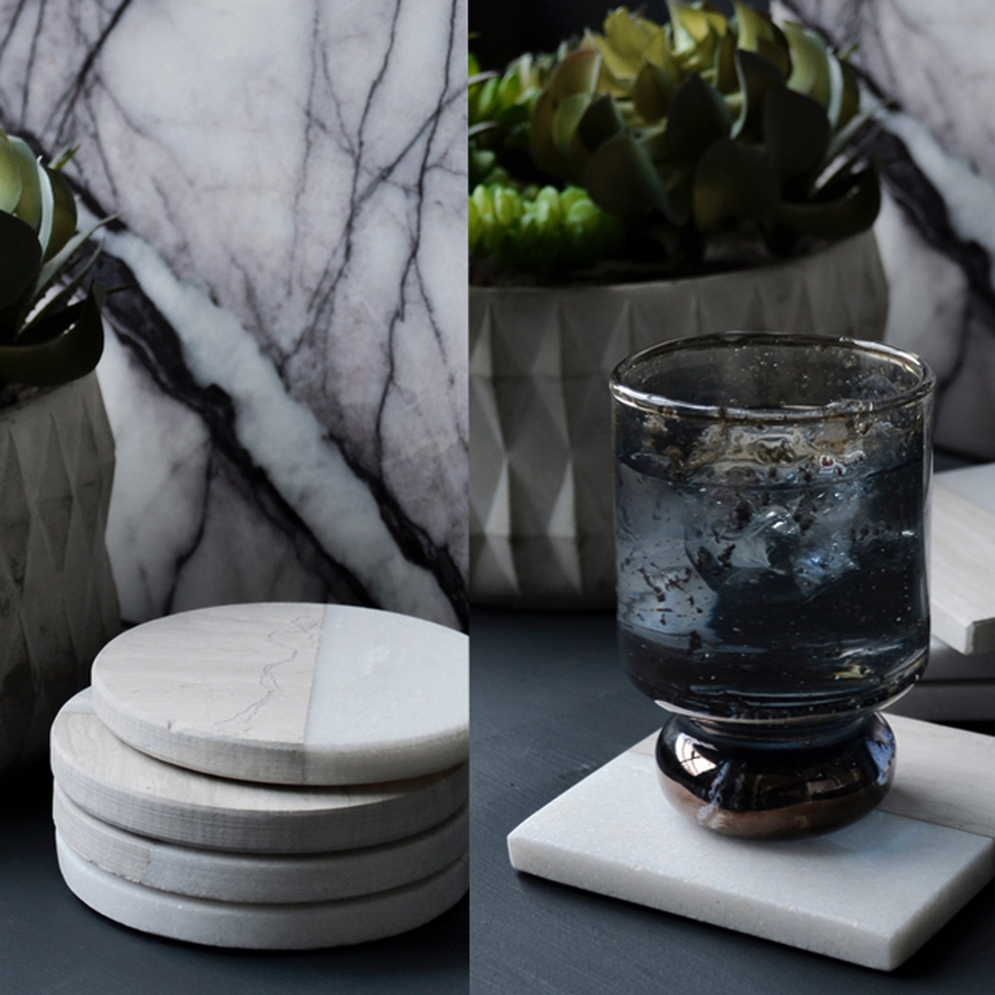 These stylish two-tone marbles coasters are one half white marble with a slight sparkle and one half a stone coloured marble with a mixture of warmer tones. They come in either a round style or square style and have soft pads underneath to make sure they rest nicely on your surfaces.  Measures D10cm x H1cm