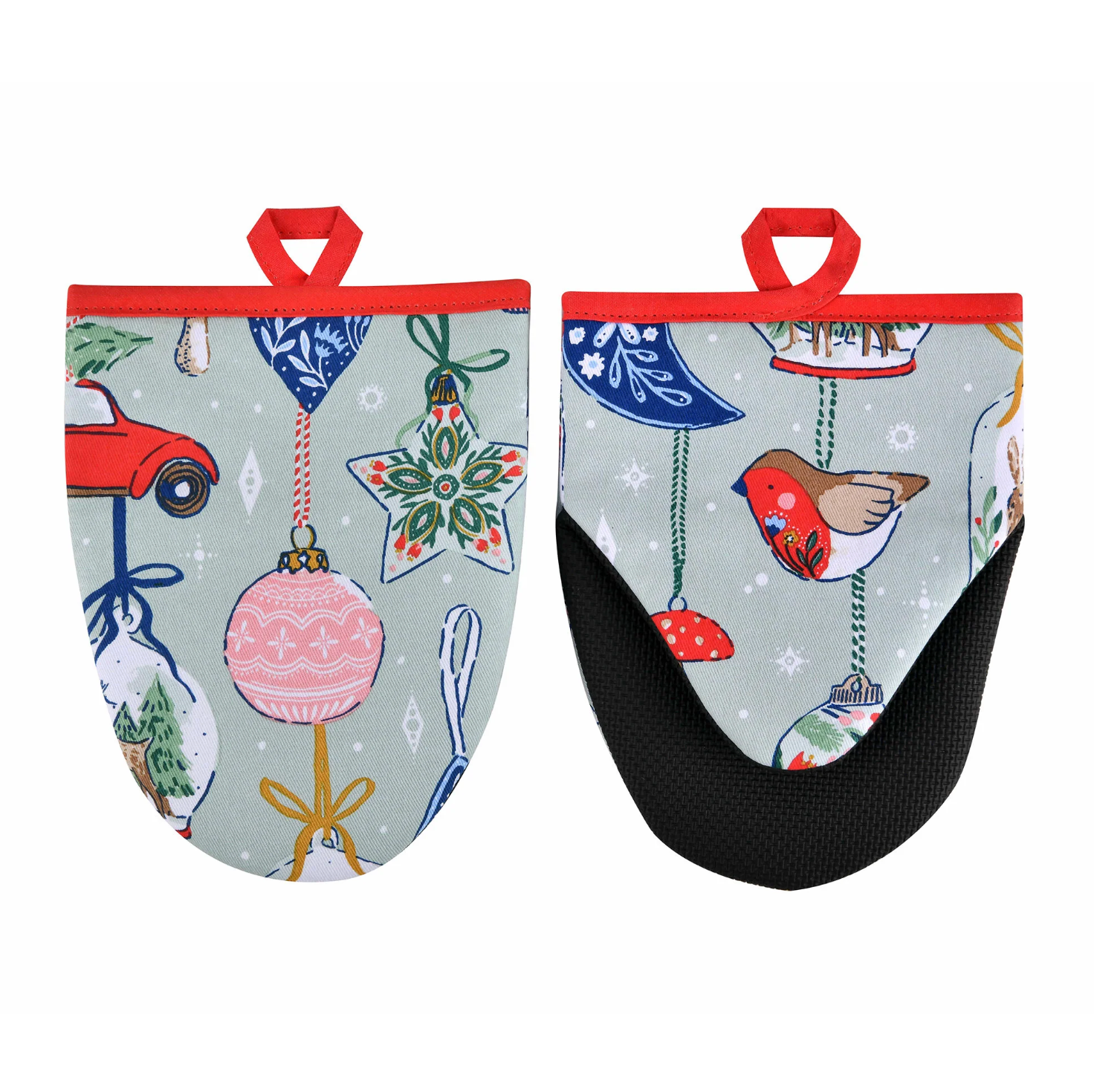 Festive oven glove mitts with charming illustrated Christmas decorations - perfect for seasonal baking.