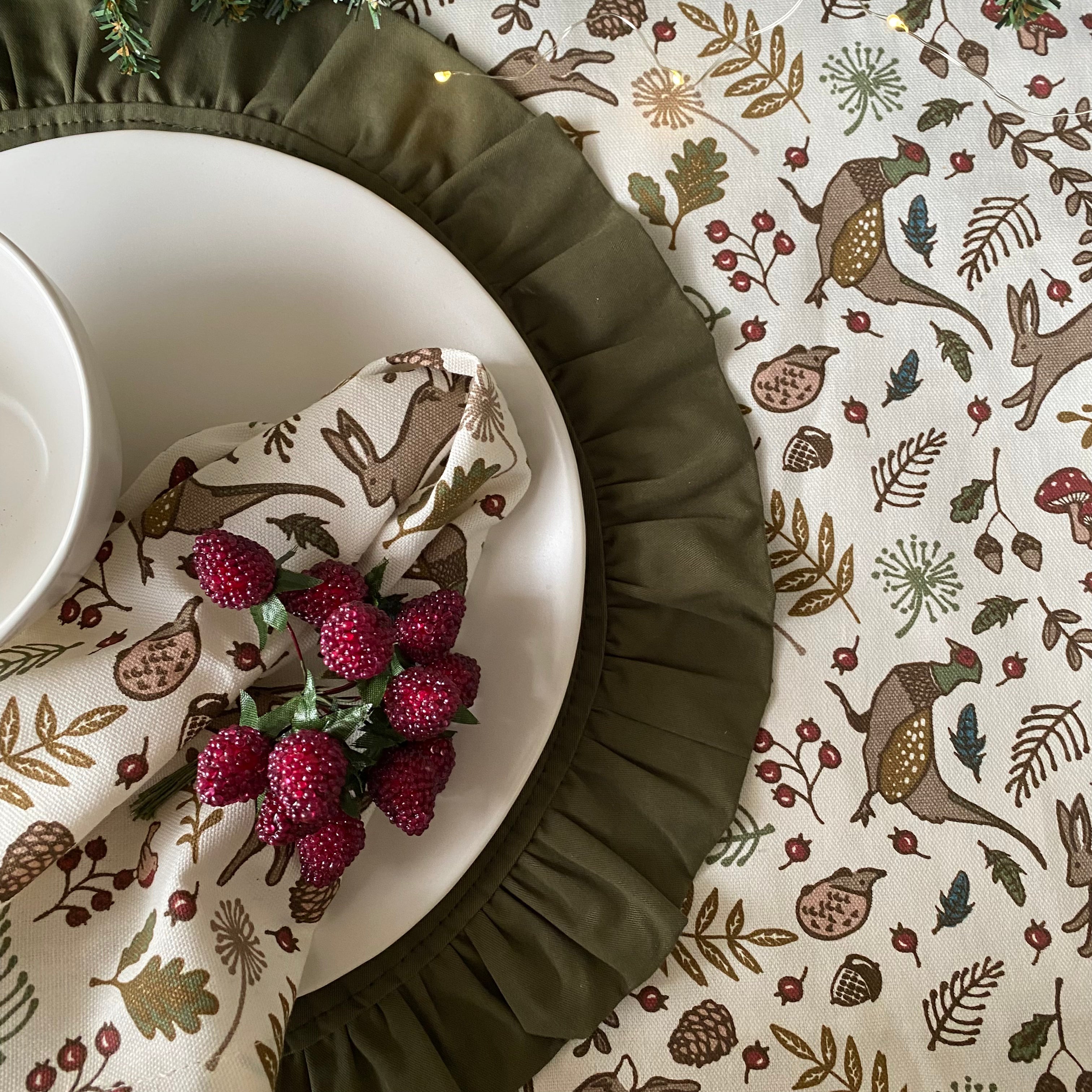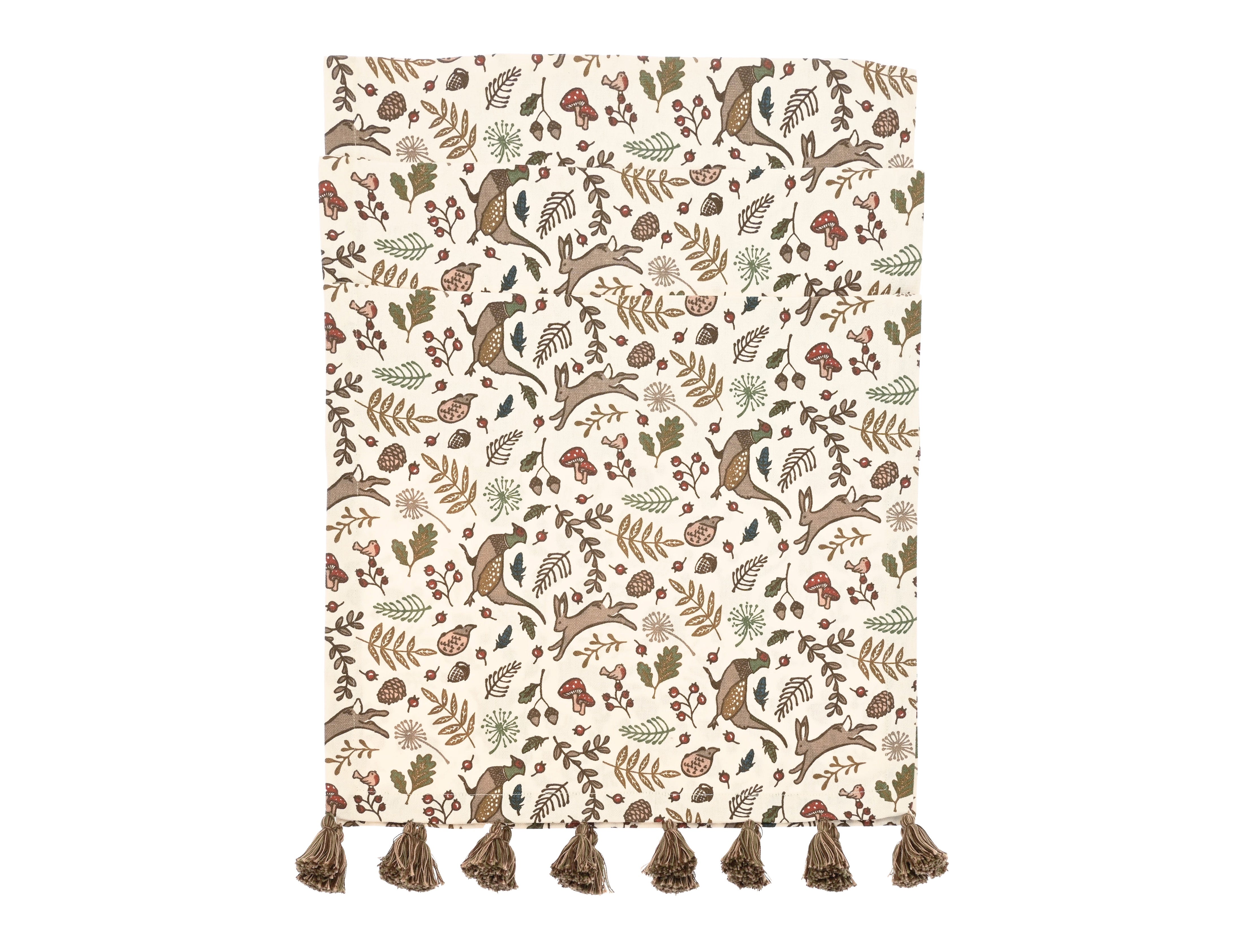 Table runner in 100% cotton in our Into The Woods print. Mixed yarn tassels at the ends.