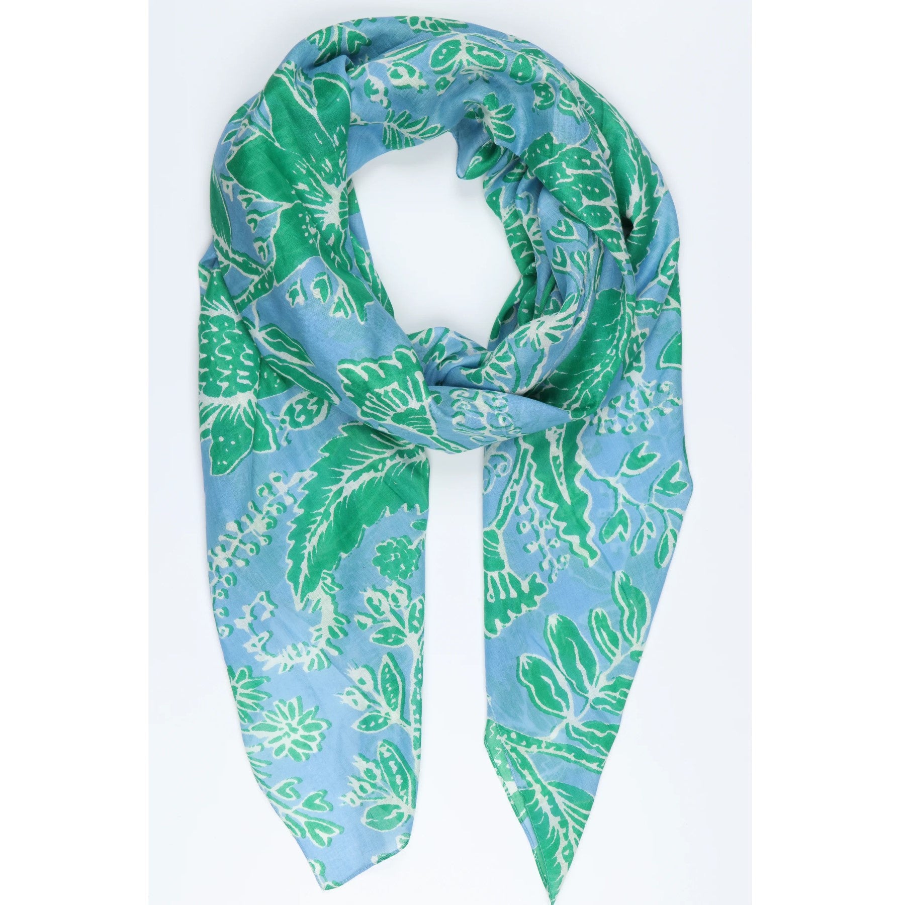 Made from 100% cotton this pretty scarf features a delicate floral print in green and blue