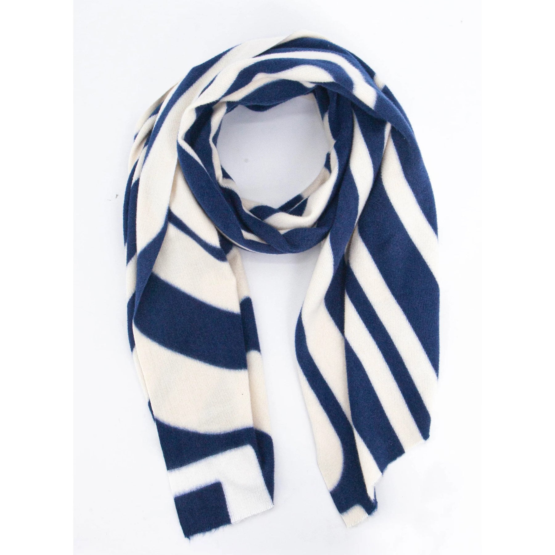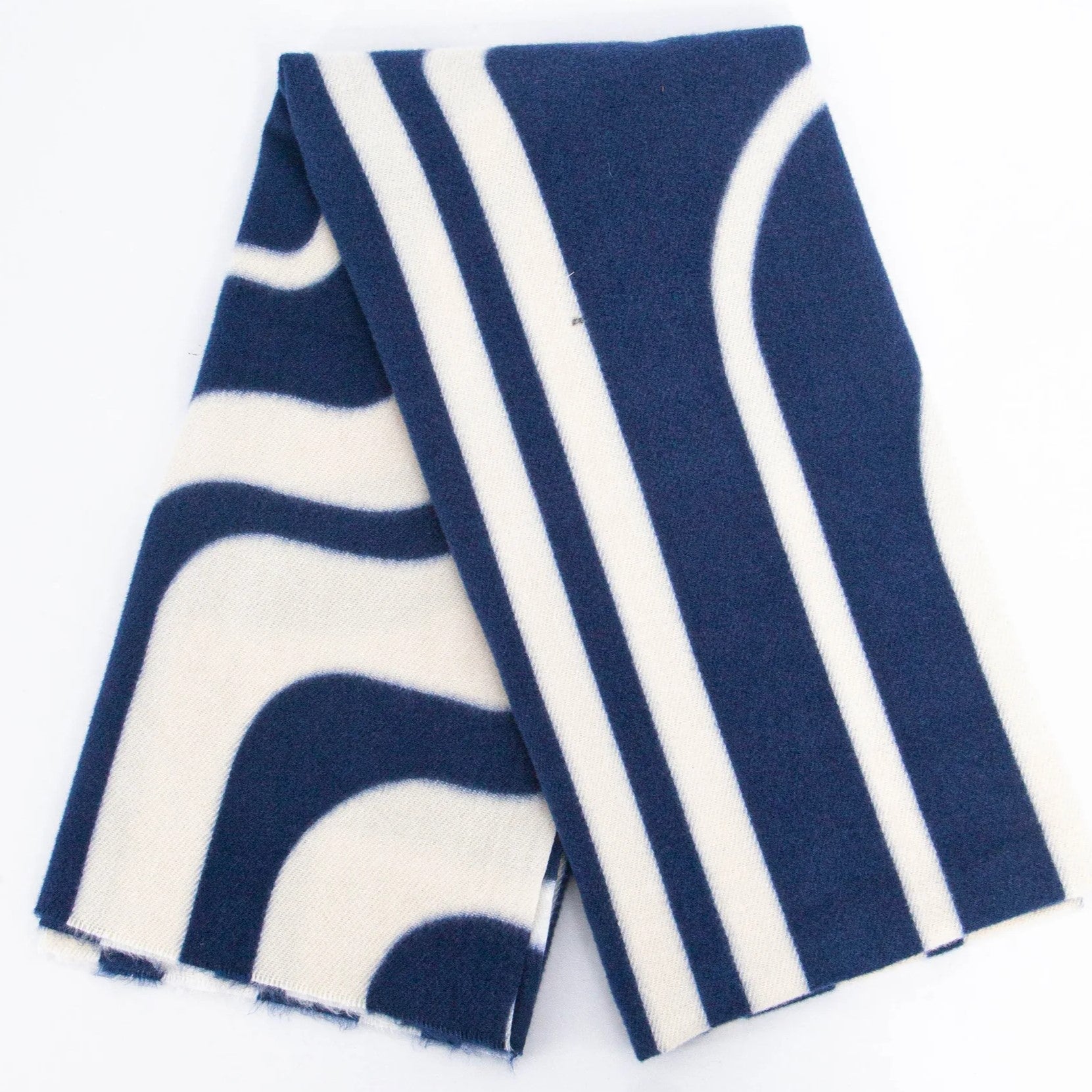 A super soft mid-weight scarf with navy blue and winter white geometric pattern. Classic and understated.