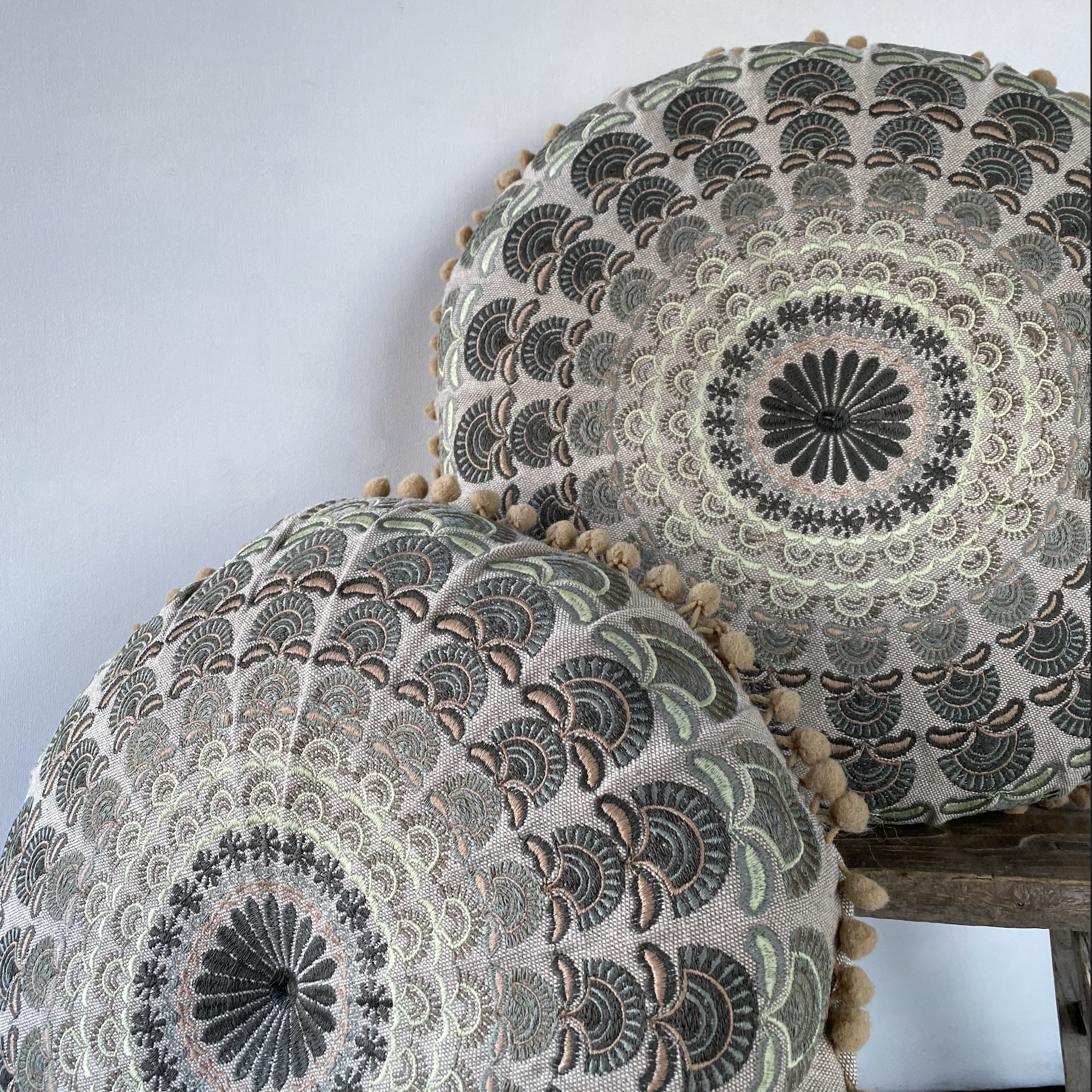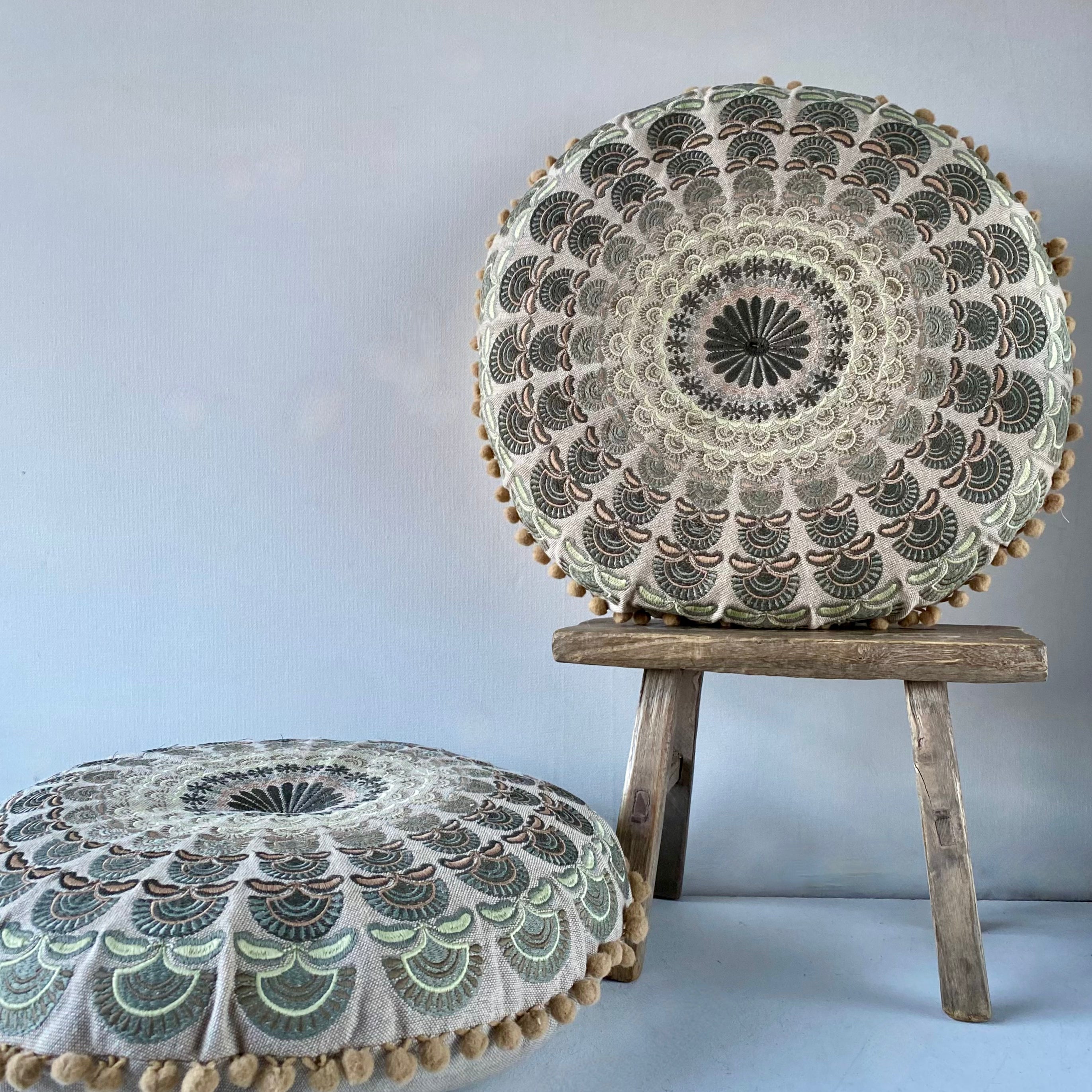 A beautifully crafted round mandala cushion in calming green and blue tones, perfect for adding colour, comfort, and personality to your space in an instant.