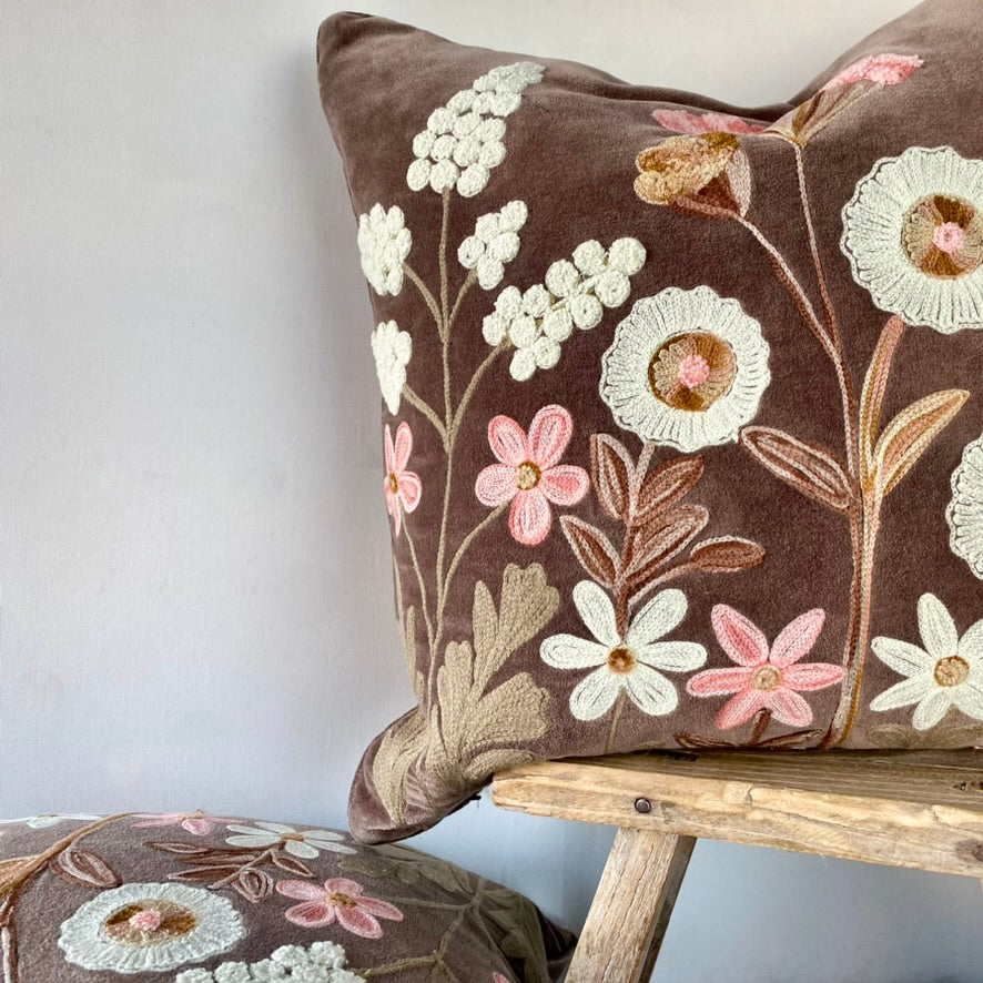 This elegant brown floral cushion is decorated with delicate embroidery and French knots. It features pink and cream woven flowers in it's centre with sage coloured stems and leaf detailing. Measuring approximately 50 × 50 cm it’s the perfect addition to your sofa, armchairs or bed, and includes a zip closure for easy removal of the feather filled pad.