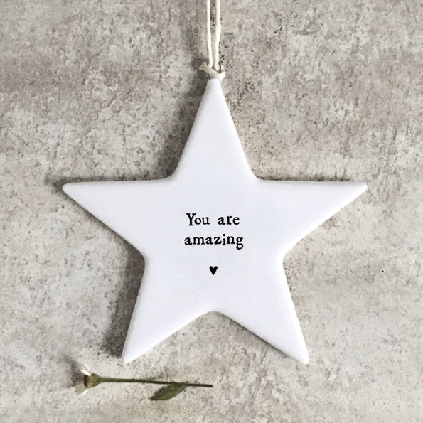 Simple and beautiful porcelain hanging star with embossed black font saying: "You are amazing". Comes complete with string for hanging. The font is black and the star measures 9cm x 9cm