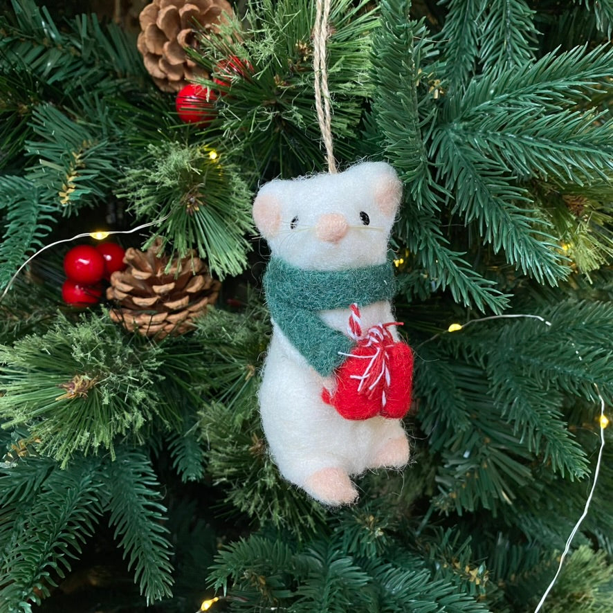Standing Decoration - White Felt Mouse with Present