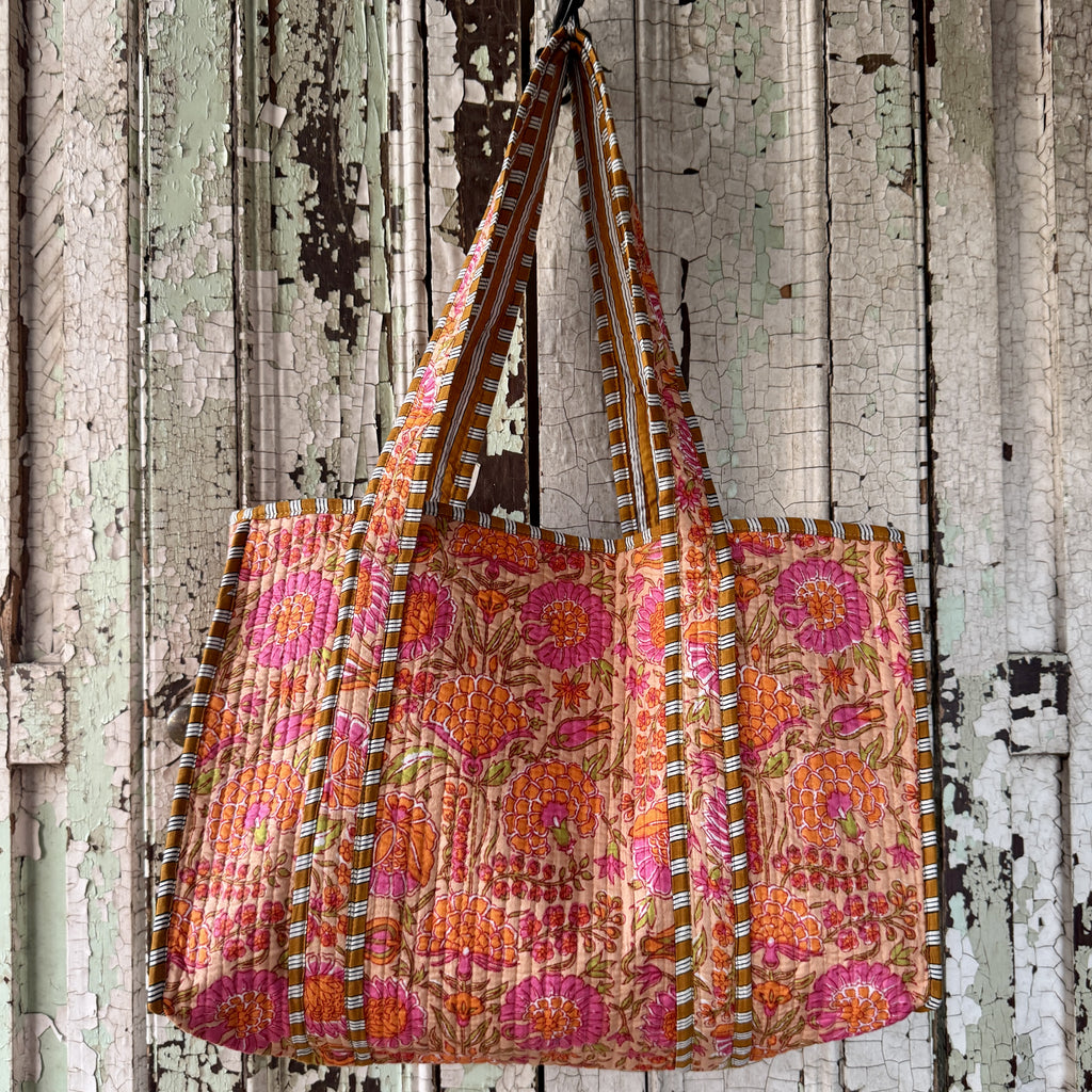 Handmade Reversible Shopper - Small, Orange & Pink Flowers