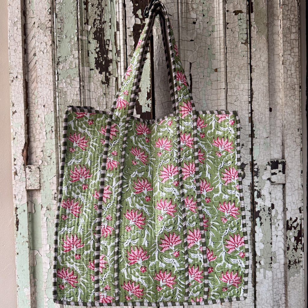 Handmade Reversible Shopper - Lrg., Green & Pink Flowers