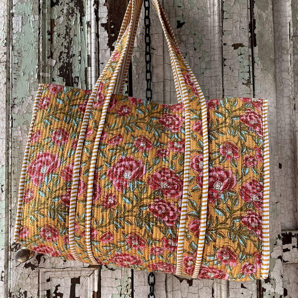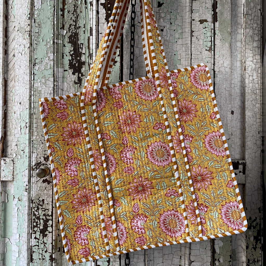 Handmade Reversible Shopper - Lrg., Mustard & Pink Flower