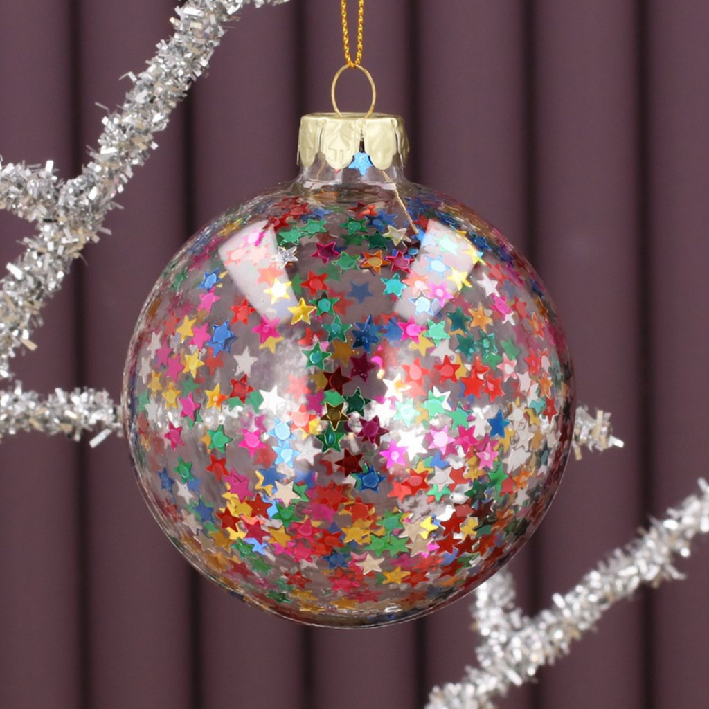 Bauble - Clear Glass with Multi Coloured Star Confetti, 8cm